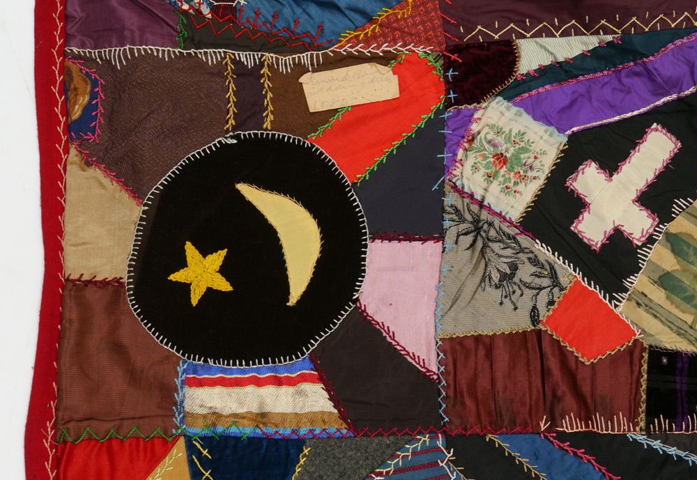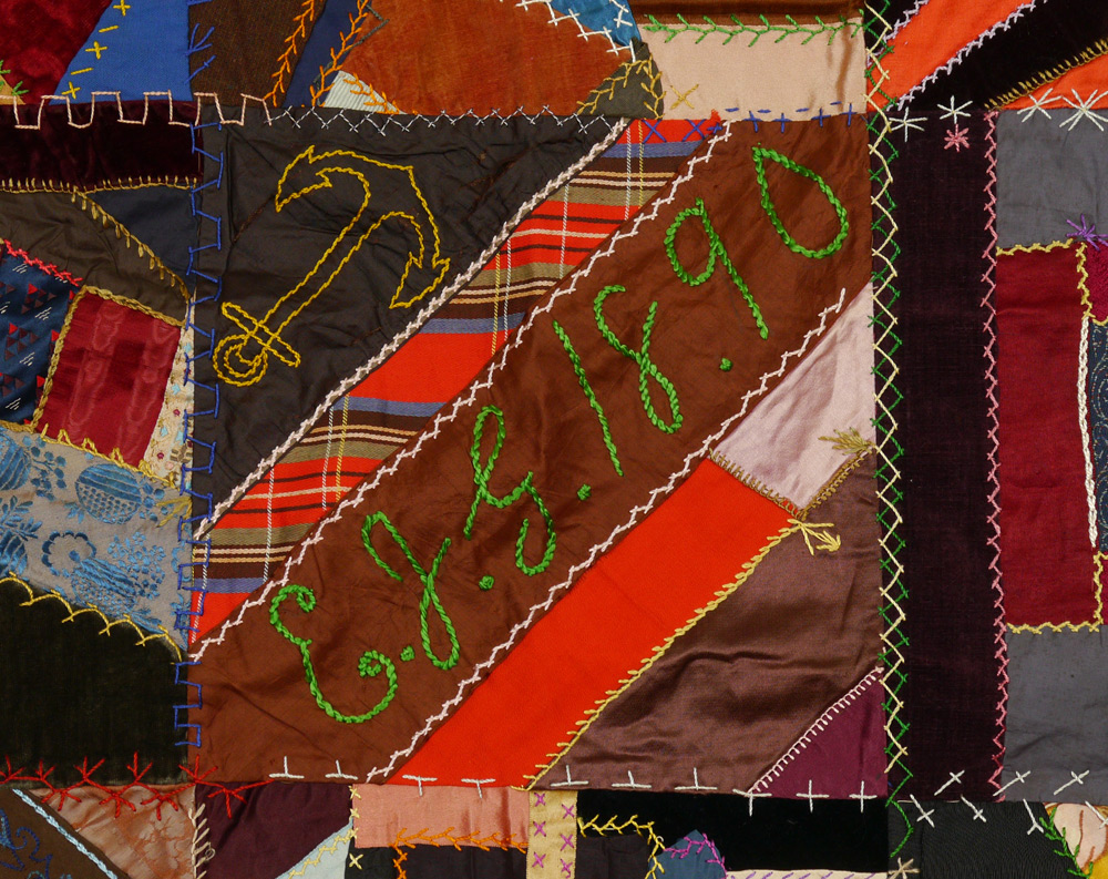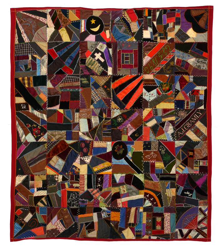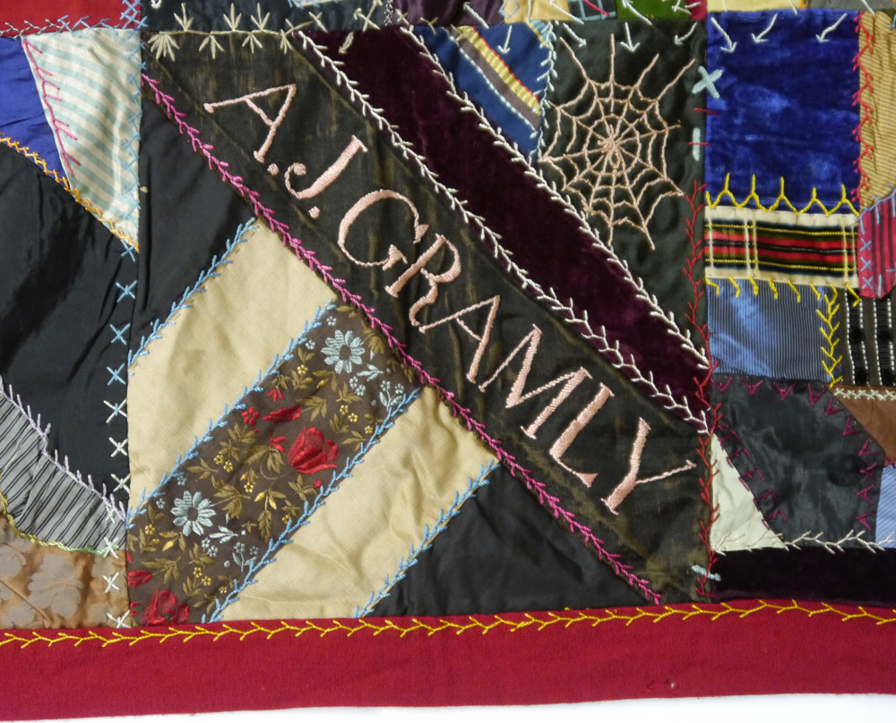 ANTIQUE CRAZY QUILT DATED 1890: Worked by EJ Gramley. Appliques and embroidery, with many of the pieces being silk. Red wool back. Measures 60'' x 67 1/2''.
