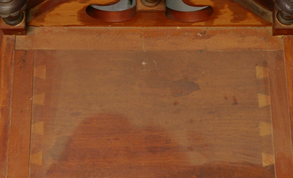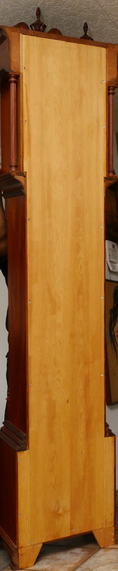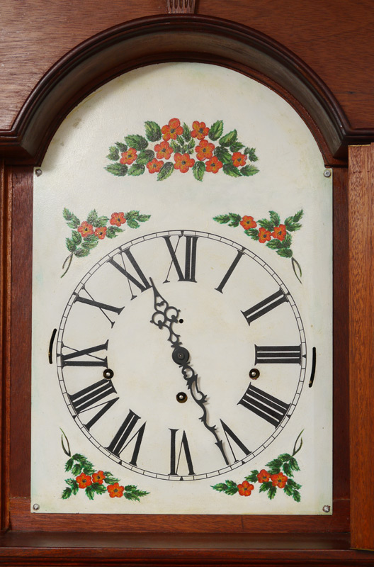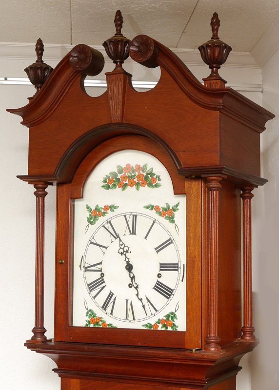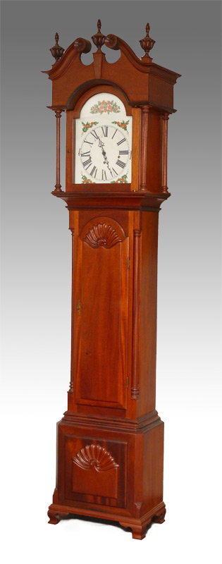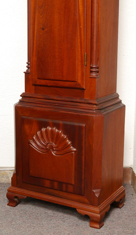 STEWART DIXON FEE JR HAND CARVED LONG CASE CLOCK: 20th century clock, case hand carved by Stewart Dixon Fee Jr. Bonnet with broken arch pediment and carved florets, 3 urn and flame finals, and fluted full column supports. Door and base with exceptionally carved double shell motifs, signed inside case. This clock is most unusual in that its case was made from several church pews rescued from the remains of a devastating fire at The First Parish Universalist Church of Stoughton, Massachusetts which burned in 1966. The inside of the case bearing the inscription ''Made by Stewart Fee for my wife Natalie, 1988''. Painted metal dial, time and strike movement. Overall measures 94 1/2'' x 20'' x 12''.