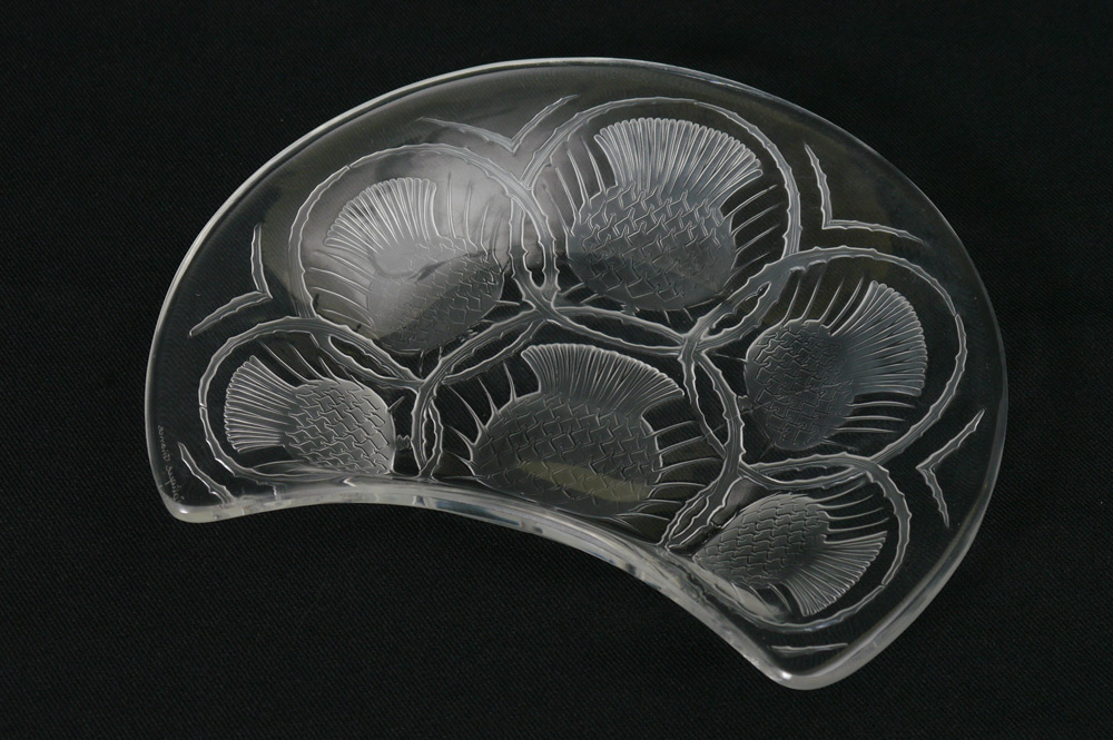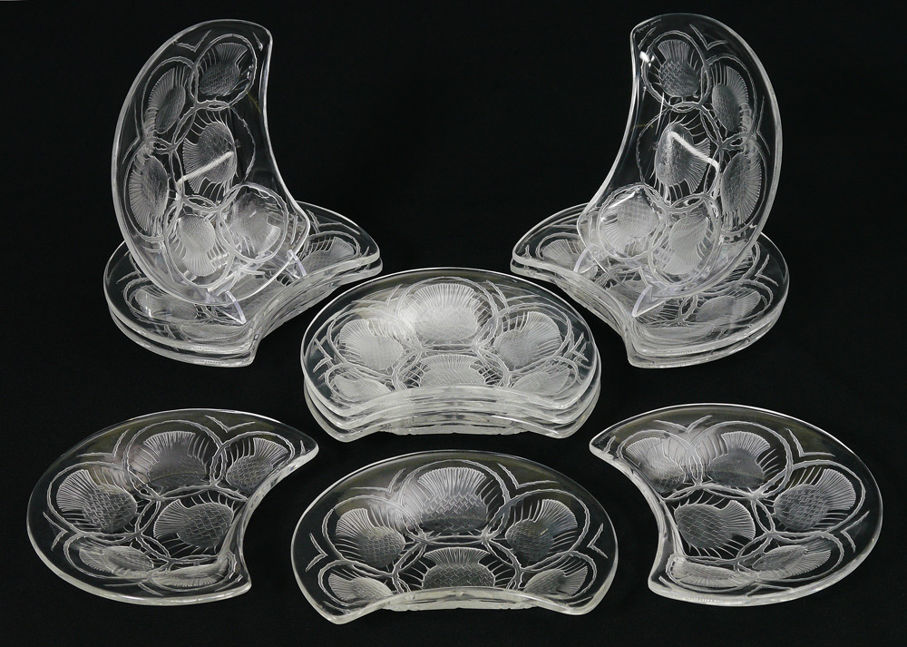 12 FRENCH LALIQUE CRYSTAL THISTLE CRESCENT PLATES: 12 pieces total with a thistle motif, signed in script Lalique, France. 8'' x 6 1/2''.