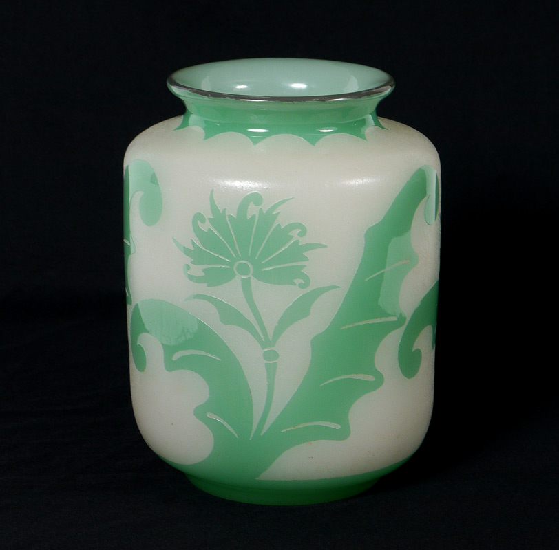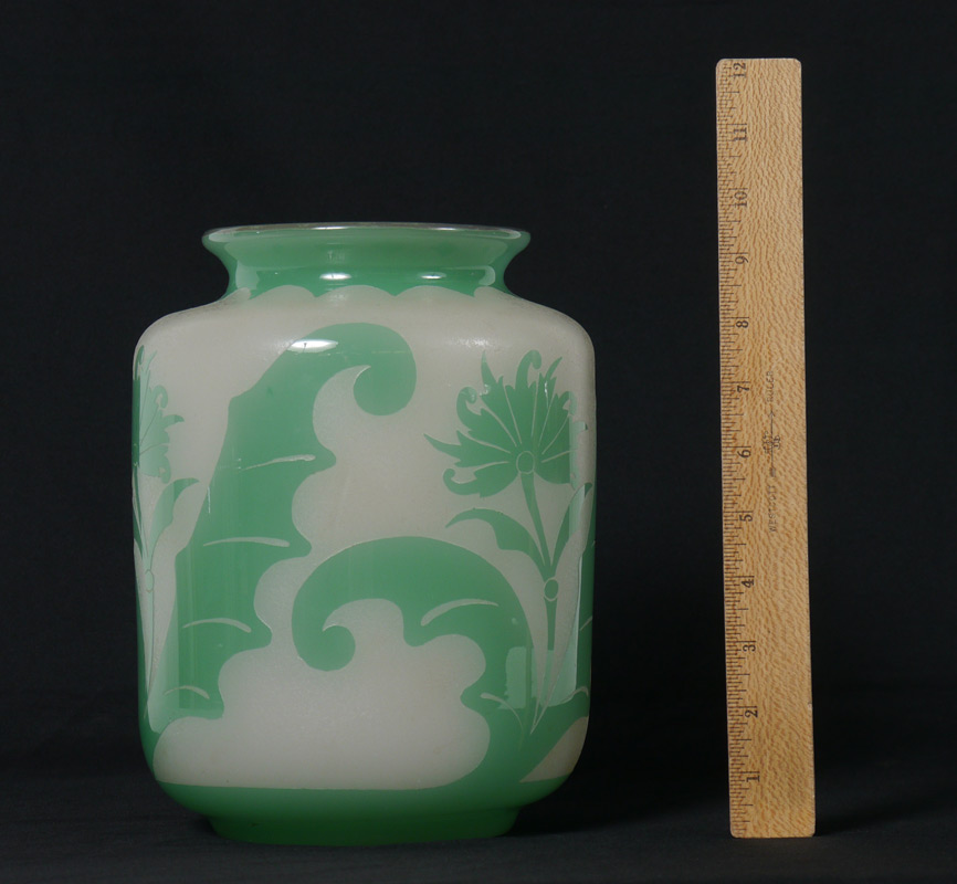 STEUBEN ACID CUT BACK JADE GLASS VASE: Jade and alabaster with a thistle design, no visible signature. Vase with flared rime, straight sides, measures 9 3/4'' h. 7'' dia.