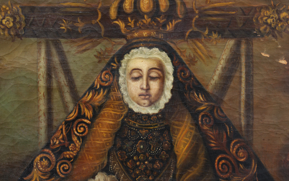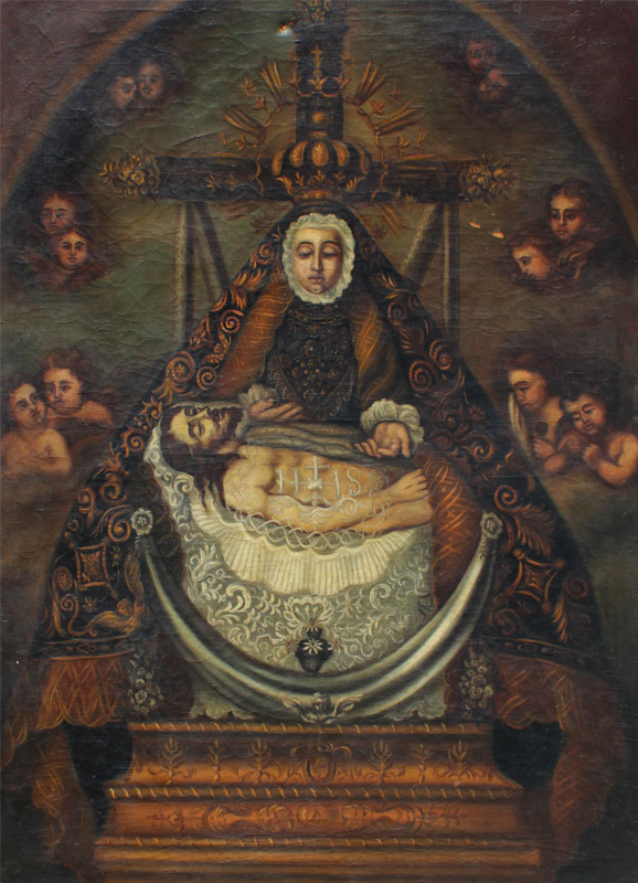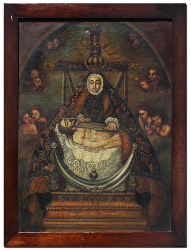 19TH CENTURY SEVILLE SCHOOL OIL/CANVAS PAINTING: 38 1/4'' x 28 1/4'', depicts a religious scene with Christ, framed, 43'' x 33''.