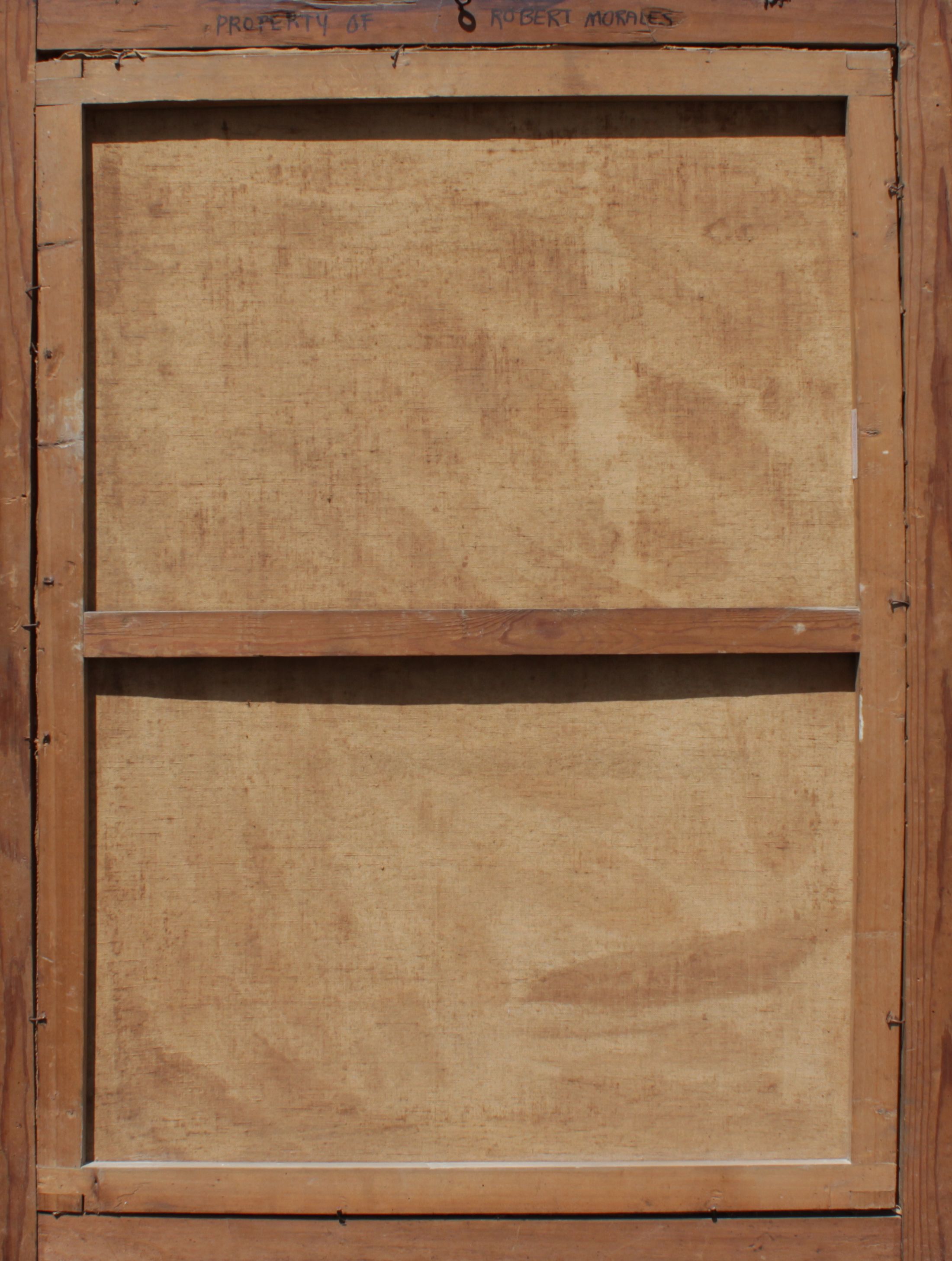 CONDITION: Several abrasions, scattered cracklure, needs cleaning, puncture in upper mid-margin, several flecks of paint loss.