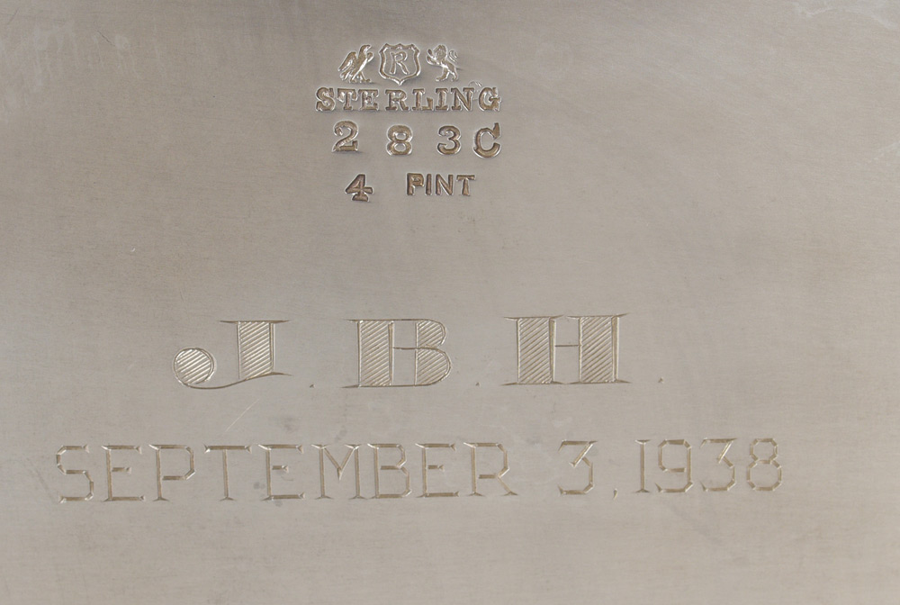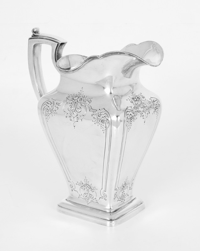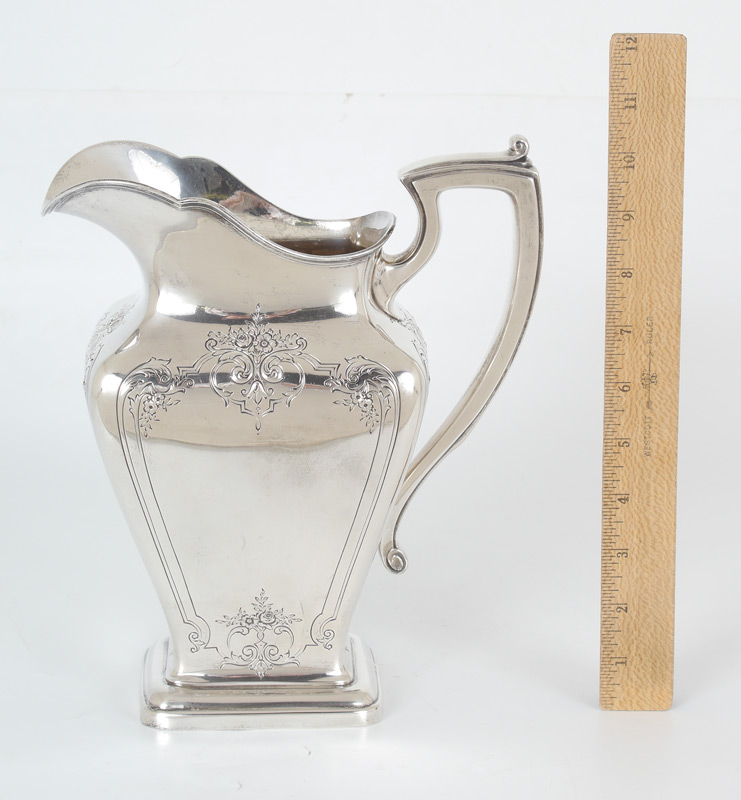 REED & BARTON STERLING WATER PITCHER: Body with engraved foliate and floral motifs. Marked on base with Reed & Barton mark, Sterling, 283C, 4 Pint. Monogrammed JBH and dated September 3, 1938. Measures 10 1/4'' h. x 8 3/4'' x 4 1/2'', approx. 32.5 troy oz.