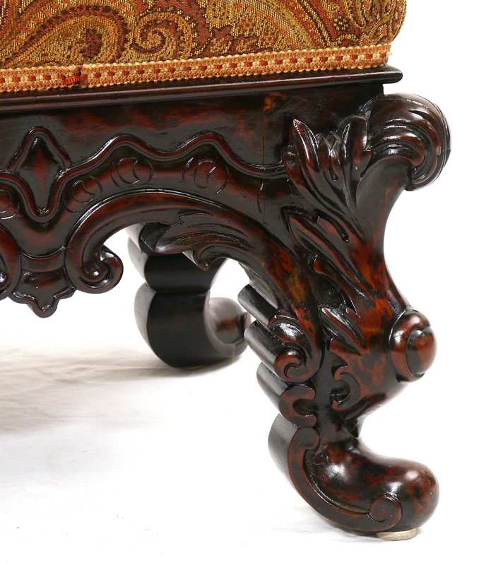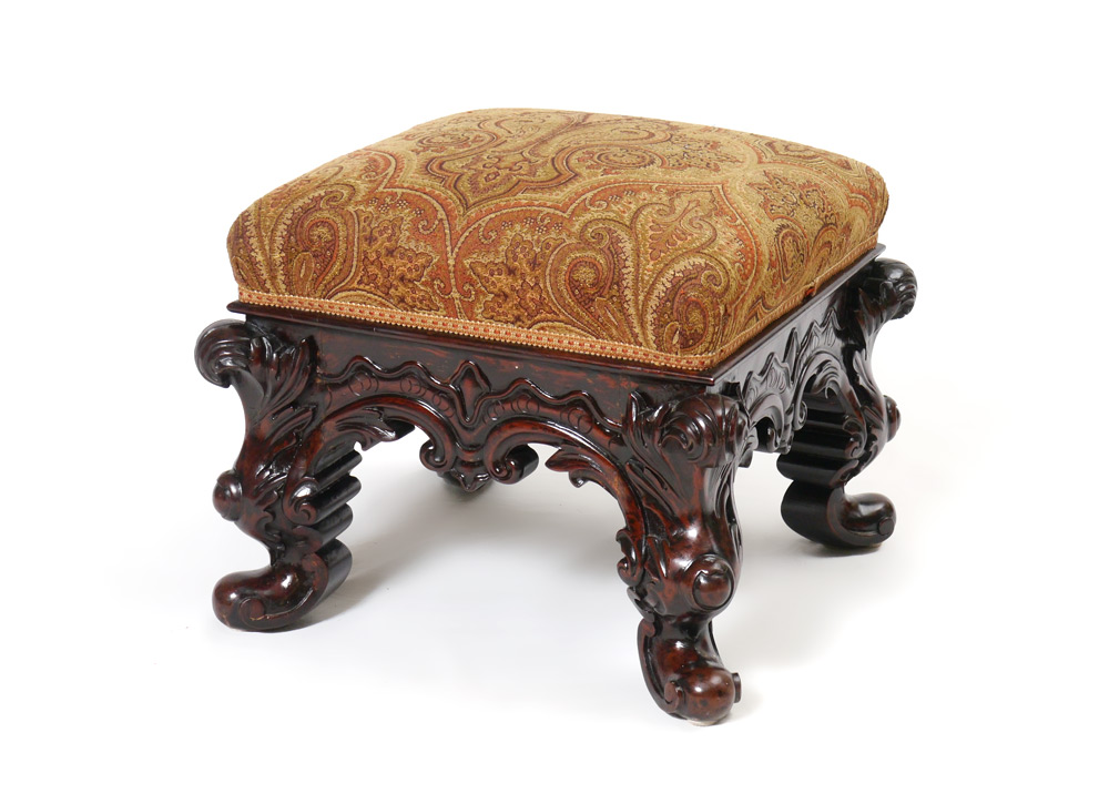 EXQUISITELY CARVED ROSEWOOD OTTOMAN: Tradition holds that this ottoman was once owned by Eva Peron. Overall measures 16 1/2'' h. x 20 1/4'' x 20 1/4''.