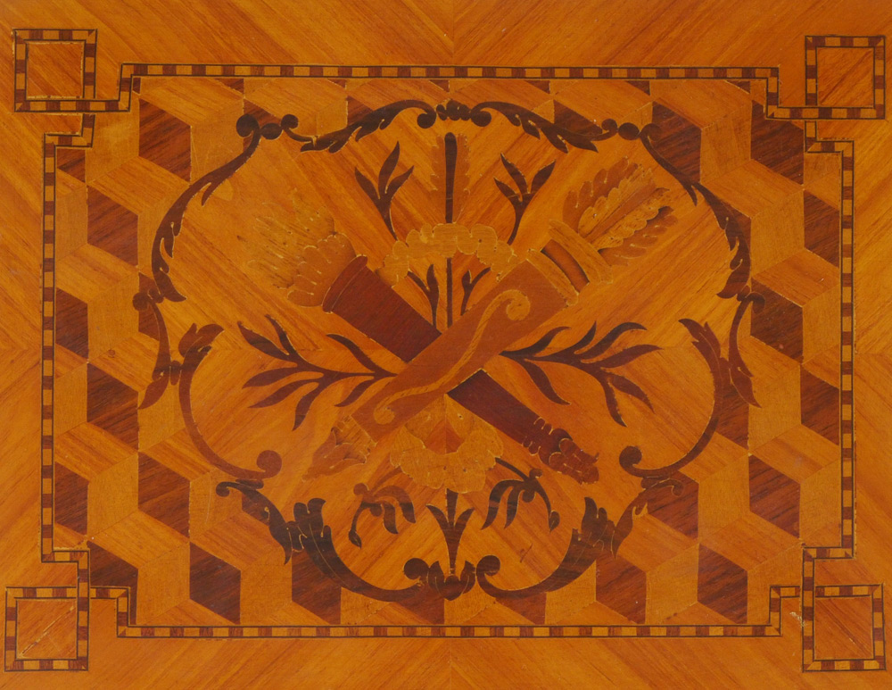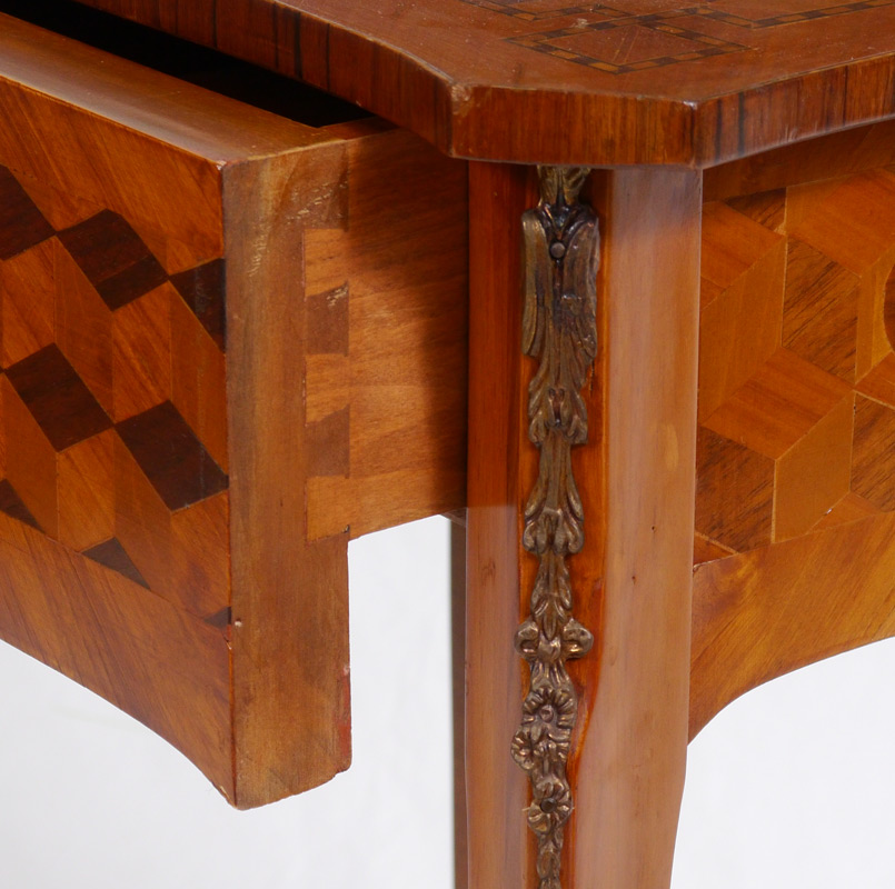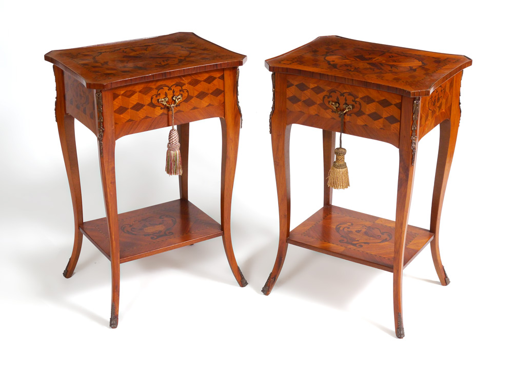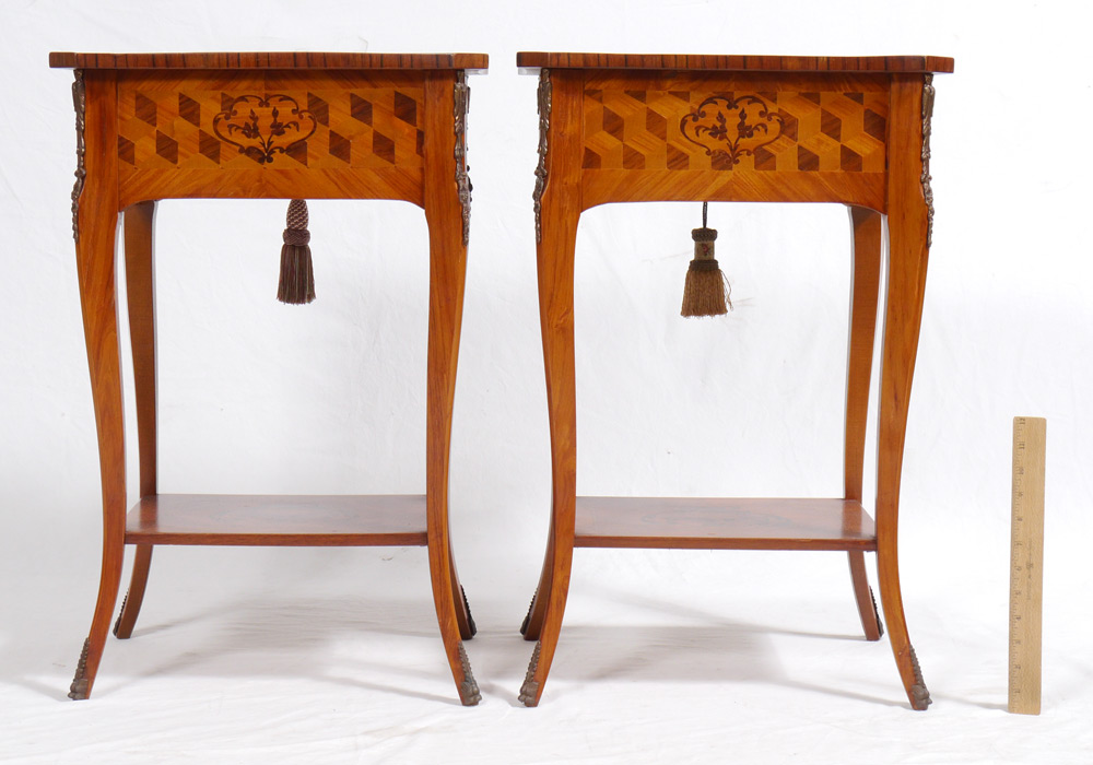PAIR FRENCH PARQUETRY INLAY SIDE TABLES: Marquetry and parquetry inlaid all over including crossed torches and floral motifs, each stand with single drawer, shaped legs, open lower shelf and applied ormolu decoration. Overall measure 26 1/4'' x 17 1/2'' x 14''.