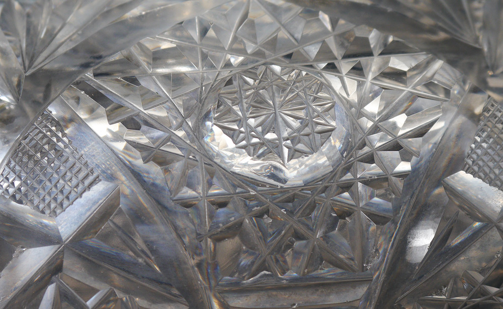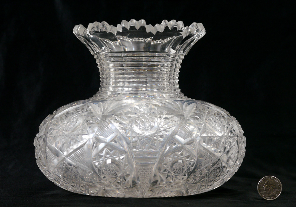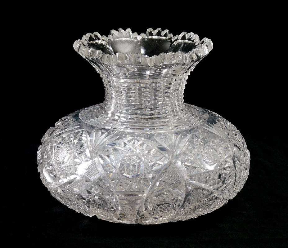 BULBOUS AMERICAN BRILLIANT CUT GLASS VASE: Flared tooth rim, step cut neck, bulbous body with hobstar and other decoration. No visible maker's mark, measures 7 1/4'' h. x 9''.