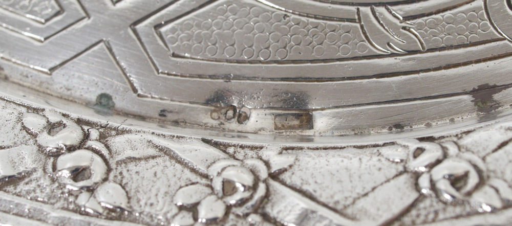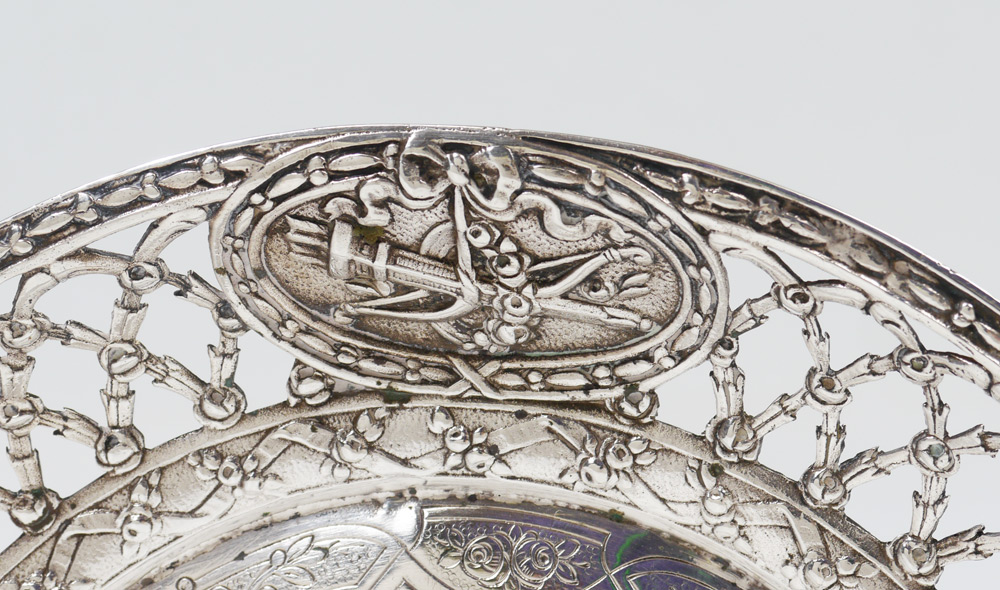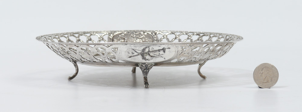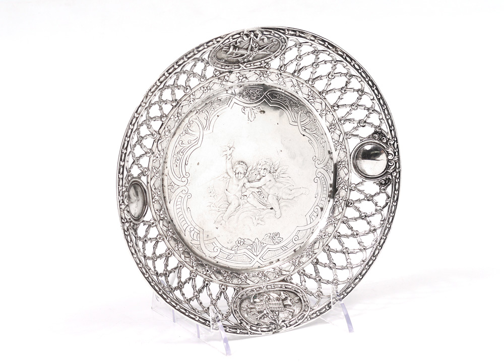 CHERUB DECORATED CONTINENTAL SILVER ROUND TRAY: .800 fine silver with illegible makers hallmark. Reticulated rim with embossed medallions, center with embossed cherubs, engraved foliate scroll, all on 4 feet. Measures 1 7/8'' h. x 8 1/2'' dia, approx. 10.3 troy oz.