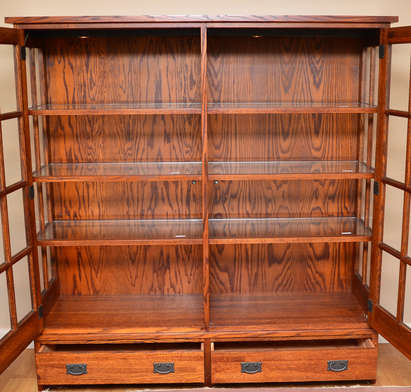 ARTS & CRAFTS MISSION STYLE DOUBLE DOOR OAK DISPLAY CABINET: 2 part cabinet, with doors having 12 panes of glass each. Illuminated interior with glass shelves. Unusual touch light feature attached to outer hinge. Rests on the base with two drawers. Key locking. Later 20th C. Measures 68'' h. x 63'' x 18 1/2''.