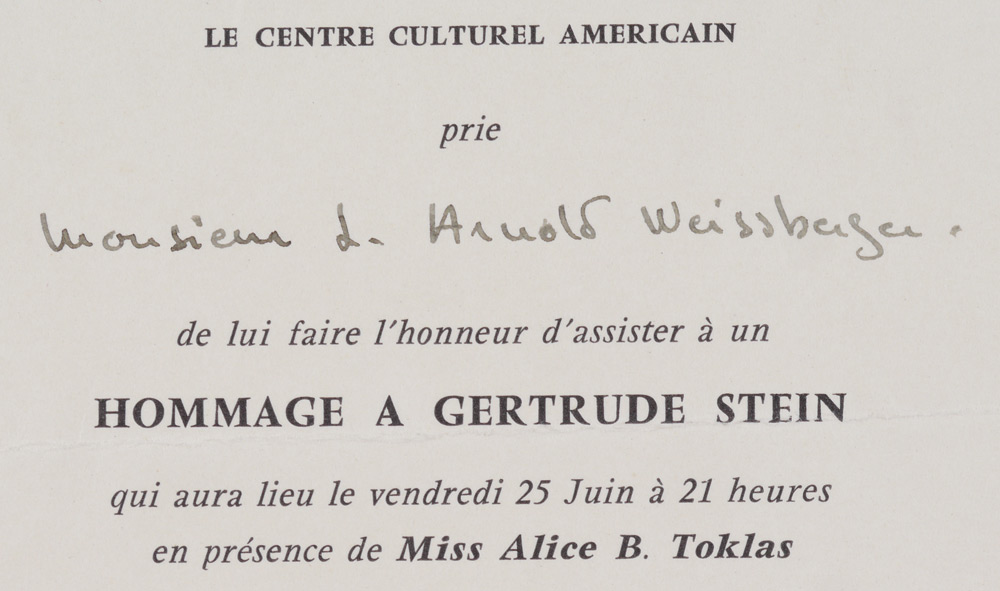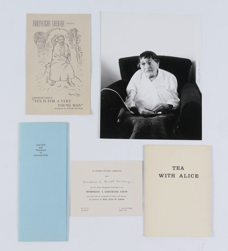 GERTRUDE STEIN & ALICE B. TOKLAS PHOTOGRAPH, AUTOGRAPH, BOOK & MANUSCRIPT LOT: To include; 1) The GI's at Gertrude's Salon Photograph w/negative 2) Alice B. Tolkas, 1959 in one of her very expensive hats, framed under glass, as well as various photographs of Alice B. Toklas, Gertrude Stein, & Friends w/negatives; 3) Tea with Alice, a booklet (New York, Christmas, 1978, copyright by Robert A. Wilson, Stein's official bibliographer and owner of the famous Phoenix bookshop in the West Village), includes a 8 x 10, black & white photograph of Toklas, taken during his visit with her in Paris in 1965. The paper-back booklet is 5 x 8, 9 pages, it was printed as an edition of 250 copies as a holiday greeting, ''none is for sale''; 4) A printed invitation, in French handwritten name Monsieur J. Arnold Weissberger, to attend an homage to Gertrude Stein ''en presence de Miss Alice B. Toklas'', on verso in pencil ''written by Alice B. Toklas''; 5) The Last Will and Testament of Gertrude Stein, 1 of the 150 copies issued on February 3, 1974, gratis (as a centennial tribute to Stein) by Frank Hallman, New York. Copy from Robert A. Wilson, Stein's official bibliographer; 6) Programme for ''In Savoy or Yes is for Yes'', Fortyeight Theatre, NYC production of the play, with reproduction of a drawing of Stein by Francis Rose, ''Programme note written by Gertrude Stein for the Pasadena production of ''Yes is for a Very Young Man''; 7) A Primer for the Gradual Understanding of Gertrude Stein, printed November 1971 in Santa Barbara for the Black Sparrow Press by Noel Young, edition limited to 500 hardcover copies; 8) Beinecke Rare Book & Manuscript Library, Yale Bound facsimiles of the five type scripts of ''In Savoy/or/''Yes is for Yes for a Very Young Man'' and an application to publish therefrom; 8) Typewritten manuscripts with handwritten notations purportedly by Stein & Toklas from the William Plumley Estate.