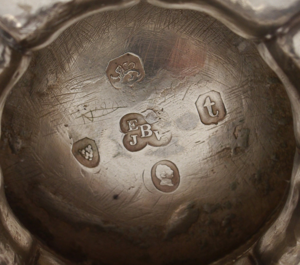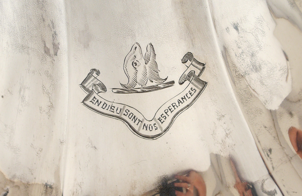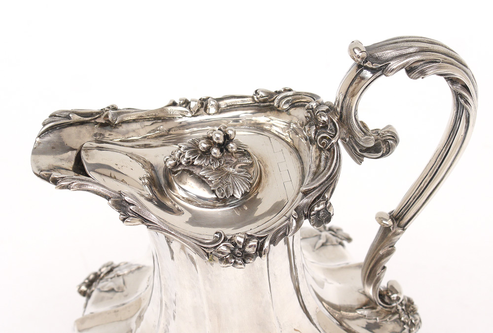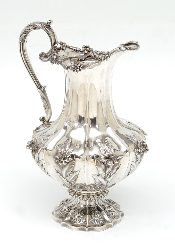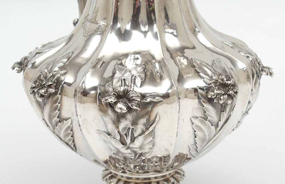 1834 BARNARD ENGLISH SILVER COFFEE POT: Hallmarked 1834 London, makers mark for Edward, Edward Jr., John and William Barnard. Hinged lid with grape finial, floral motif rim, fluted body with engraved motto ''En Dieu Sont Nos Esperances (Our Hopes are in God)'', under figural dolphin head on both sides. Floral embossed waist with applied decoration, embossed fluted foot. 11 1/4'' h. x 8 1/2'', approx. 32.9 troy oz.