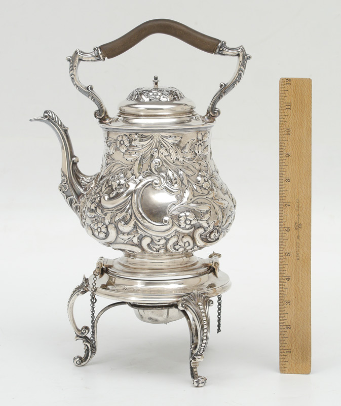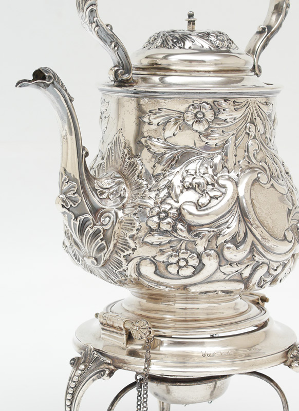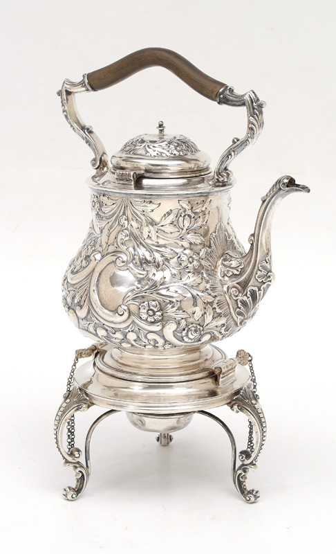 1911 JOSEPH RODGERS & SONS ENGILSH SILVER KETTLE ON STAND: Hallmarks for 1911 Sheffield and Joseph Rodgers & Sons on kettle, stand and burner. Kettle with fixed ebony handle, hinged lid, body with repousse floral and foliate motifs. Stand with 3 legs, original burner. Overall measures 14 1/2'' h. x 10'' assembled, approx. 55.5 troy oz. inclusive of all parts.