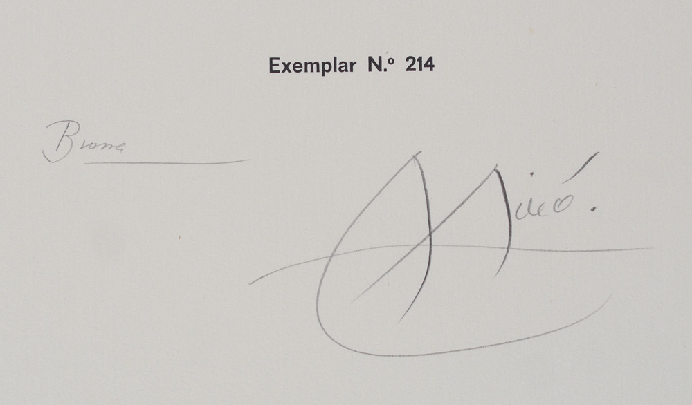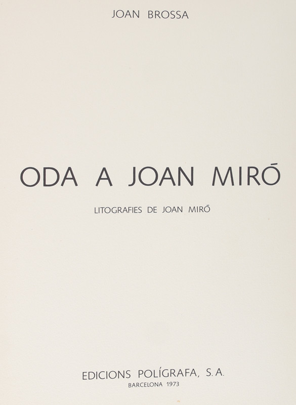 MIRO, Joan, (Spanish, 1893-1983): ''Oda A Joan Miro, Lithografies de Joan Miro'', book, Edicions Poligrafa, S. A., Barcelona, 1973 by Joan Brossa. Pencil signed in back by Miro and Bossa, #214 of total edition size of 500. 13 1/2'' x 10''
