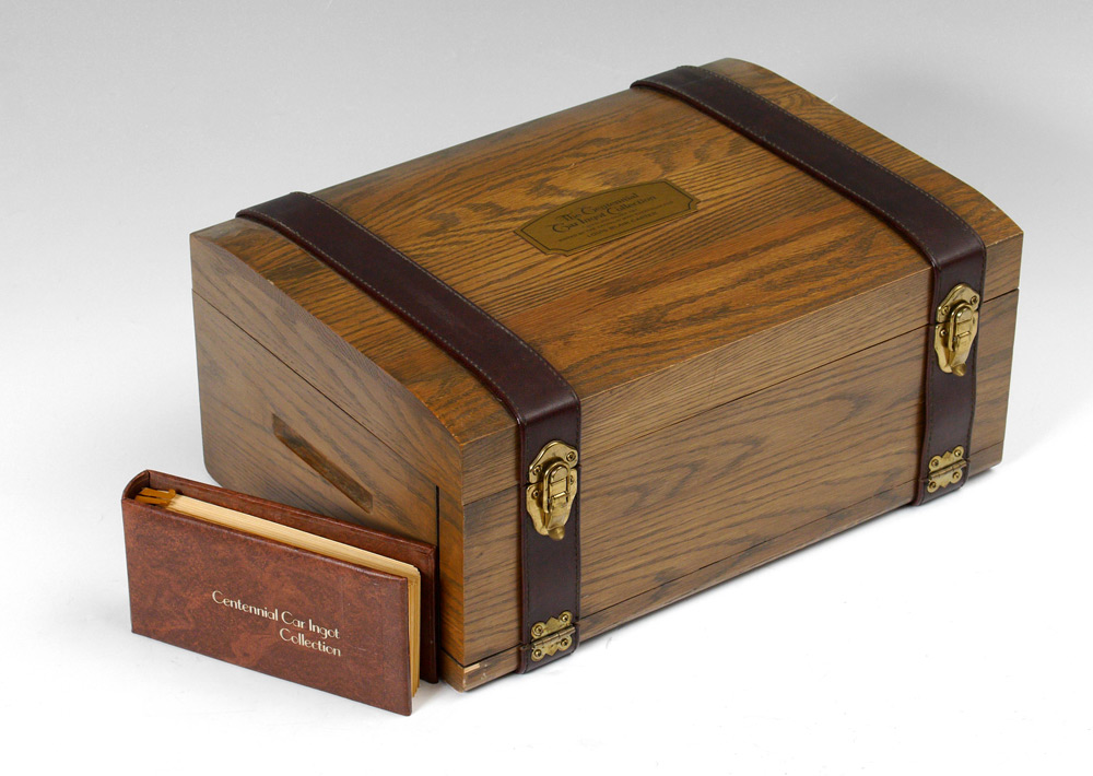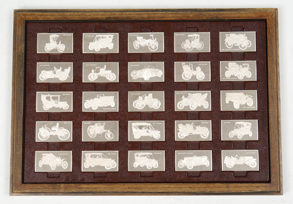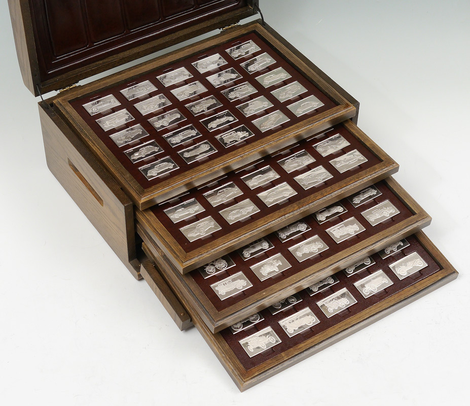 STERLING SILVER CENTENNIAL CAR INGOT COLLECTION: From the Franklin Mint, circa 1973-1978, 100 of the worlds most popular cars in individual 1000 grains (approx. 2.08 troy oz) sterling silver ingots. Sold with the original 4 drawer collectors chest and book, brass plaque with original owners name remains. The ingots included in this set are the following: 1875 Marcus,1885 Benz, 1886 Daimler, 1893 Duryea, 1895 Panhard-Levassor, 1896 Ford, 1898 Winton, 1899 Packard, 1899 Renault, 1900 De Dion Bouton, 1901 Mercedes, 1901 Oldsmobile, 1903 Cadillac, 1903 Lanchester, 1905 Napier, 1905 Peerless, 1906 Rolls Royce, 1907 Thomas, 1909 Buick, 1909 Ford, 1909 Lozier, 1909 Stanley, 1909 White, 1910 Austro-Daimler, 1910 Chadwick, 1911 Marmon, 1911 Simplex, 1912 Cadillac, 1912 Hispano-Suiza, 1913 Locomobile, 1913 Mercer, 1913 Peugeot, 1913 Stutz, 1916 Dodge, 1916 Hudson, 1916 Morris, 1916 Packard, 1916 Pierce-Arrow, 1923 Chevrolet, 1924 Chrysler, 1924 Lancia, 1924 Vauxhall, 1925 Austin, 1925 Bentley, 1925 Doble, 1925 Franklin, 1925 Lorraine-Dietrich, 1927 Amilcar, 1928 Ford, 1928 Mercedes-Benz, 1929 Alfa Romeo, 1929 Chevrolet, 1930 Hispano-Suiza, 1930 Isotta Fraschini, 1931 Bugatti, 1931 Cadillac, 1931 Invicta, 1931 Marmon, 1931 Stutz, 1932 Delage, 1932 Ford, 1932 Lincoln, 1933 Duesenberg, 1934 Chrysler, 1934 Citroen, 1934 Lagonda, 1935 Auburn, 1935 Bugatti, 1936 Fiat, 1936 Maybach, 1937 Cord, 1937 Delahaye, 1937 Mercedes Benz, 1938 Alpha Romeo, 1938 Volkswagen, 1939 BMW, 1941 Lincoln, 1946 M.G., 1948 Jaguar, 1949 Citroen, 1949 Ferrari, 1950 Aston Martin, 1950 Rover, 1953 Porche, 1954 Mercedes-Benz, 1956 Citroen, 1958 Lotus, 1959 Rolls-Royce, 1960 Austin, 1961 Jaguar, 1963 Chevrolet, 1964 Porche, 1965 Ford, 966 Lamborghini, 1967 Jensen, 1970 Datsun, 1970 Ferrari, 1970 Mercedes-Benz, 1974 Jaguar, 1975 Volkswagen.