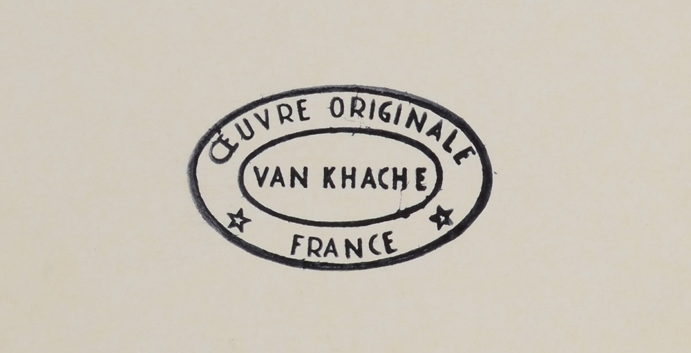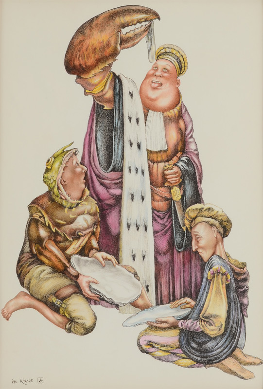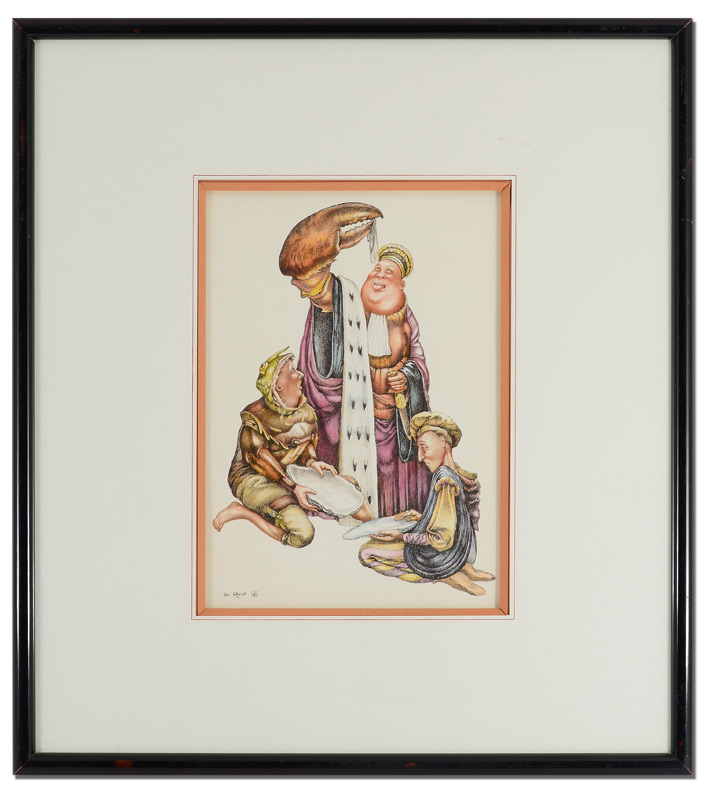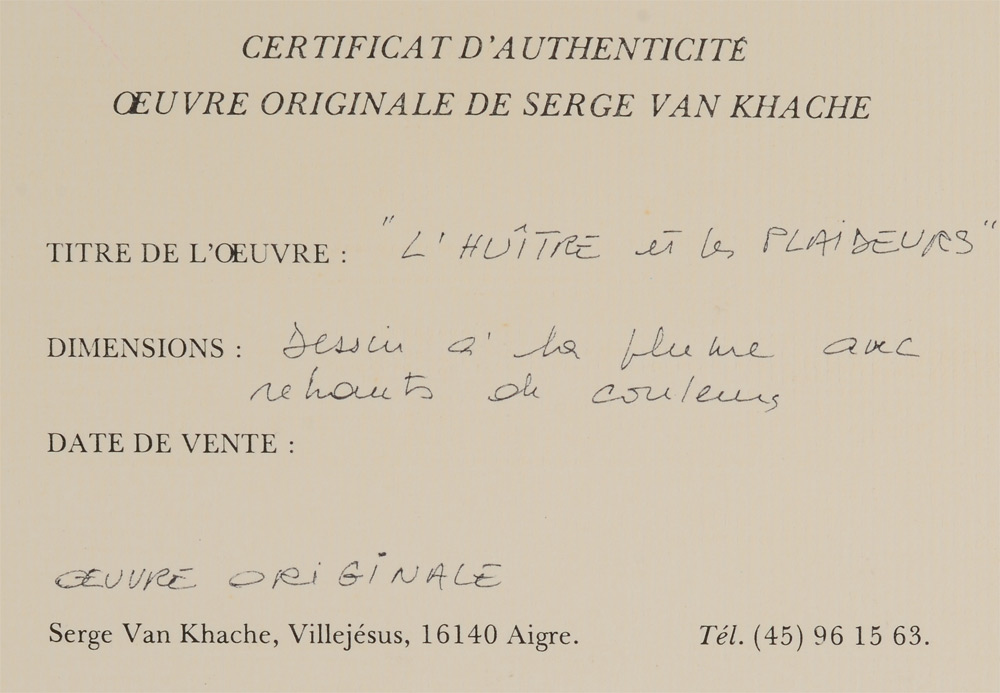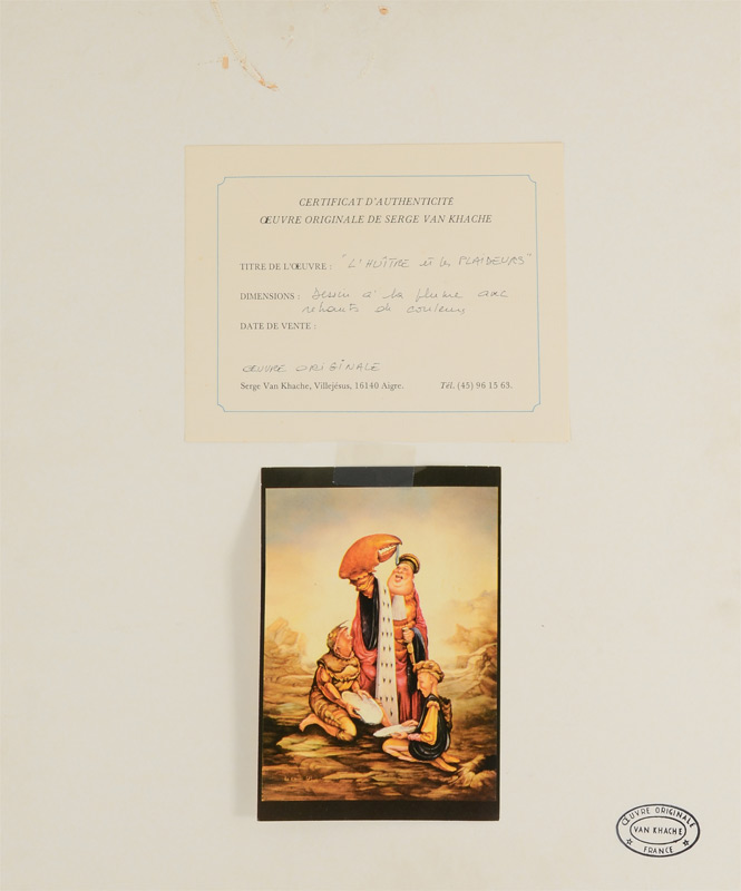 VAN KHACHE, Serge, (French, 1946- ): ''L'Huitre et le Plaideurs'', Drawing with Color, Sight size 10 1/2'' x 7 1/2'', signed lower left, certificate from the Artist affixed verso, framed 19 1/4'' x 17 1/4''.