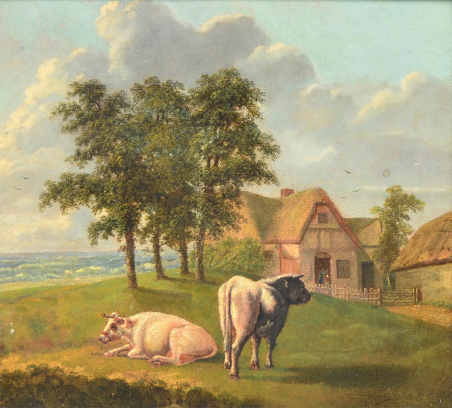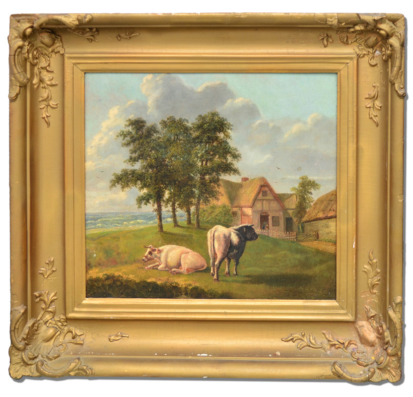 19TH CENTURY CONTINENTAL PAINTING OF COWS BY THE SEASHORE: Oil/Canvas, 16 1/8'' x 17 3/8'', no visible signature, older gesso frame 23 1/2'' x 24 1/2'' x 3 1/2''.