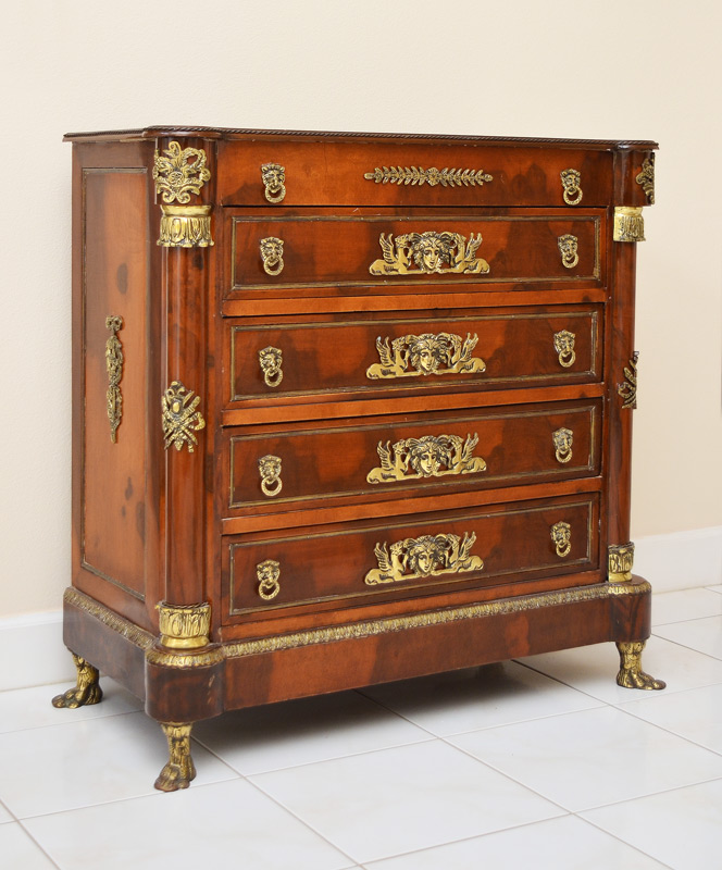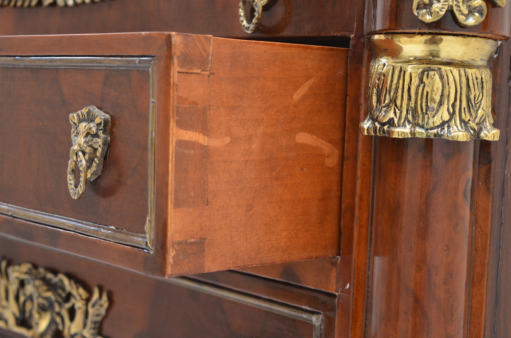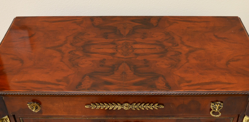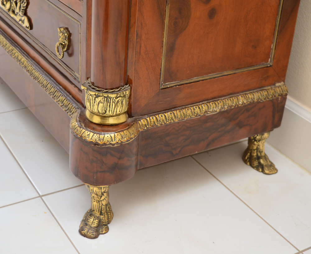 LOUIS XV STYLE 4 DRAWER COMMODE: Jon Luis Vashion leather label. Rich in ormolu decoration, down to the metal paw feet. Match book veneer top with cookie corners. Measures 36'' tall x 35'' x 17 3/4''.