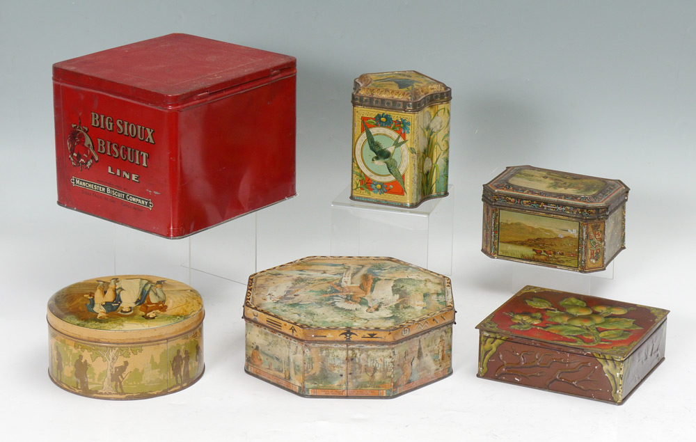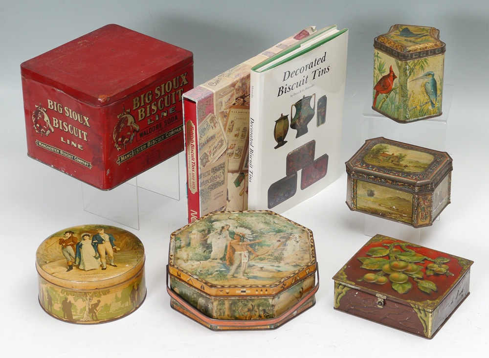 COLLECTION OF 6 BISCUIT ADVERTISING TINS: 6 pieces total to include 1) Big Sioux Biscuit Line Waldorf Soda square tin, 7'' x 9 1/4'' x 8 1/4''. 2) Loose-Wiles Biscuit Company Hiawatha's Wedding tin with handle, 3 3/4'' h. x 9 3/4''. 3) Huntley & Palmers tin 3 3/4'' x 6 3/4'' x 5''. 4) Huntley & Palmers ''Two Strings To Her Bow'' round, 3 1/2'' h. x 7 1/4''. 5) Huntley & Palmers square tin with hinged lid, 2 1/2'' x 7 1/2'' x 6 3/8''. 6) Peek, Frean & Co. bird house form, 6'' h. x 5'' x 5''.
