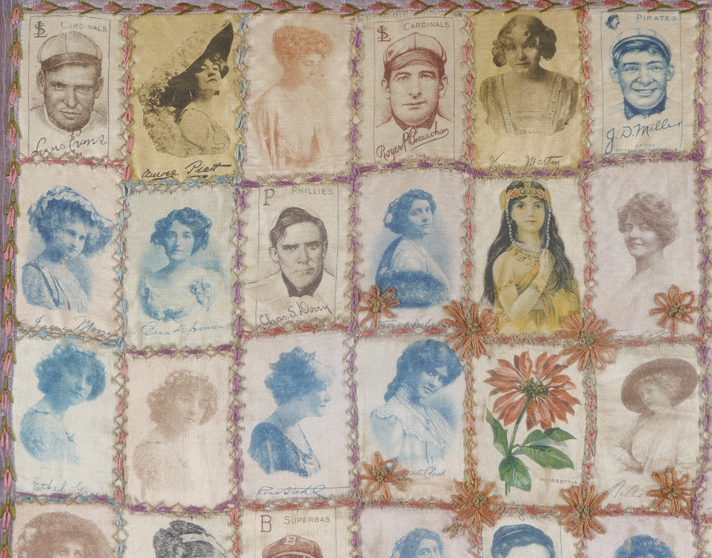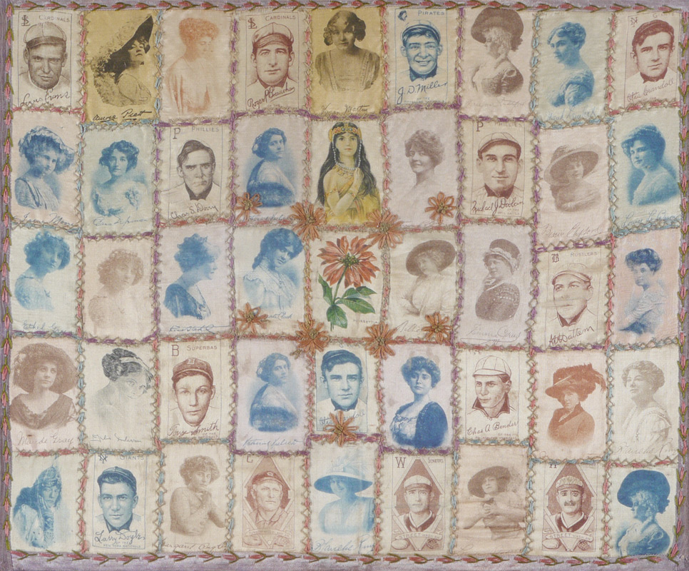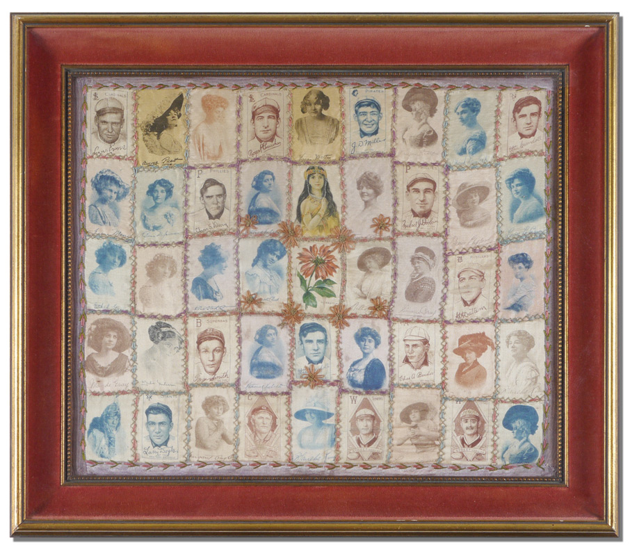 FRAMED BASEBALL & ACTRESSES TOBACCO SILKS: 45 tobacco silks woven together in a ''quilt'' comprising primarily of American actresses and baseball players. Sight size 13 3/4'' x 17'', framed in shadowbox frame 18 1/4'' x 21 1/2'' x 1 1/2''.
