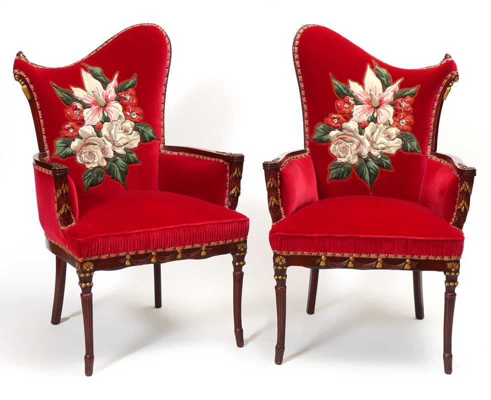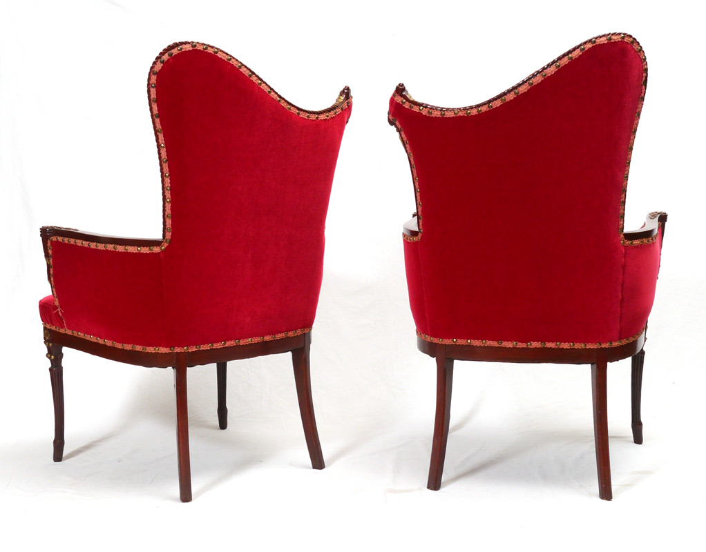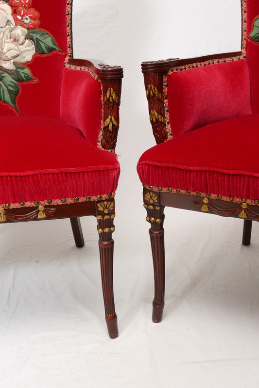 PAIR UPHOLSTERED FRENCH SIDE CHAIRS: Shaped back and arms, carved handle holds, supports, apron and fluted legs. Red upholstery with puffy floral motif on seat backs, overall measures 44'' h. x 27 1/2'' x 26 1/2''.