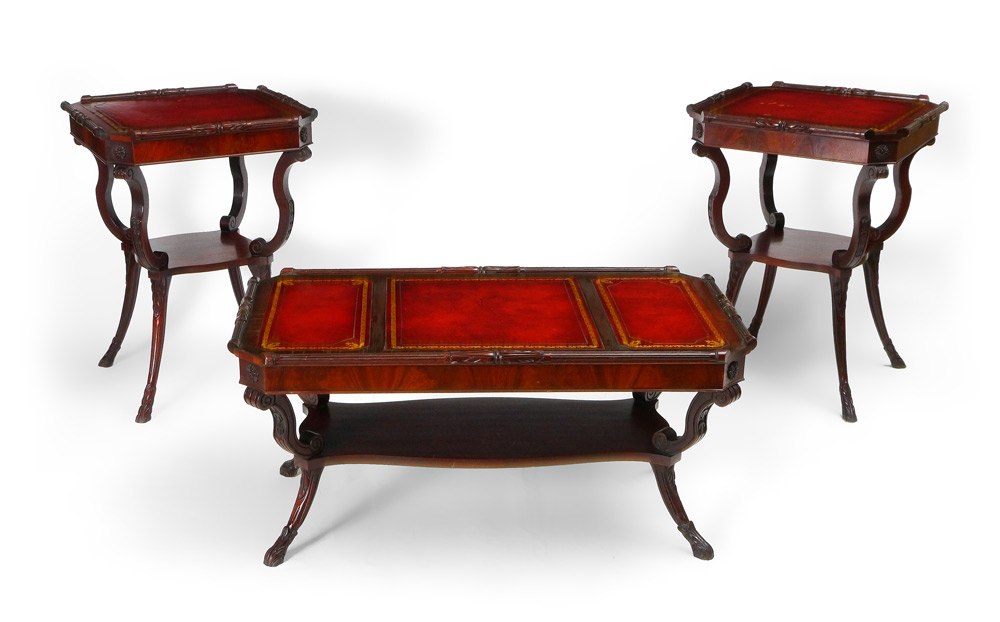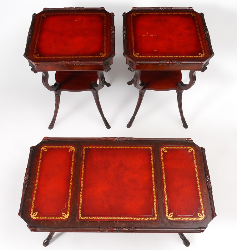 3 PIECE FRENCH COFFEE TABLE & LAMP TABLES: 3 pieces total, each with inset embossed leather panels under glass tops, carved trim, over skirt with applied decoration at corners, carved and shaped supports with open lower shelf. Coffee table measures 18 3/4'' h. x 40'' x 22'', side tables 29 1/2'' h. x 22'' x 22''.