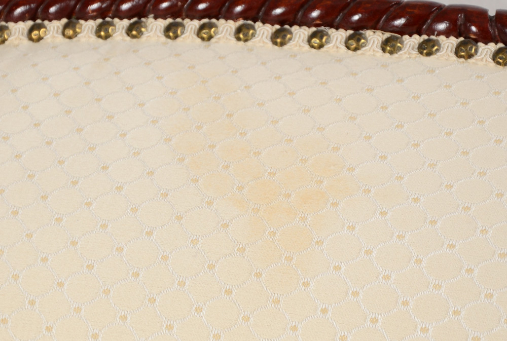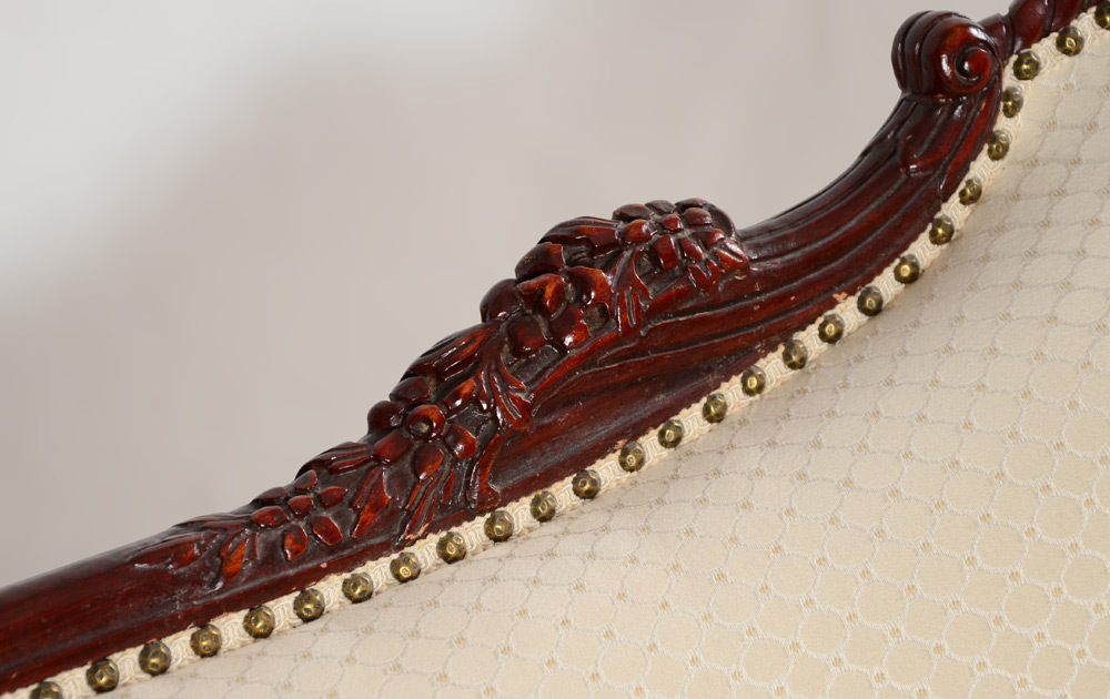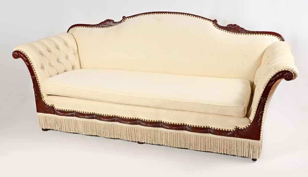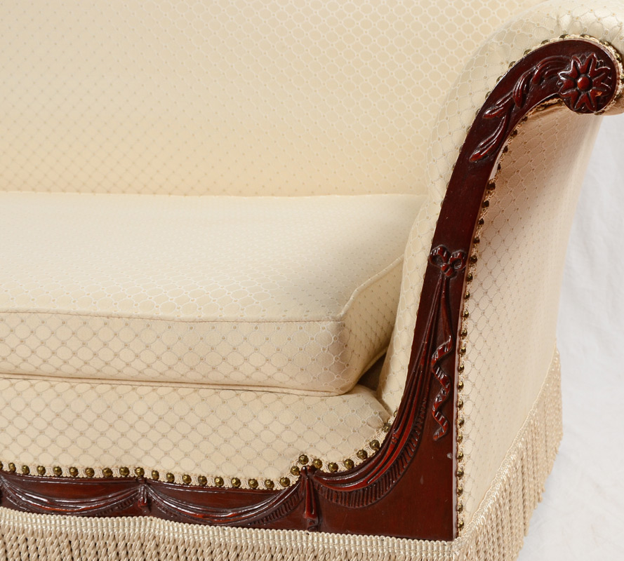 FRENCH STYLE CARVED SOFA: Foliate and rope twist carved and shaped top rail, arms and skirt with garland swag. Tacked ivory patterned upholstery with tufted scroll arms, tassel fringe under skirt. Overall measures 36 1/2'' h. x 87 1/4'' x 35''.