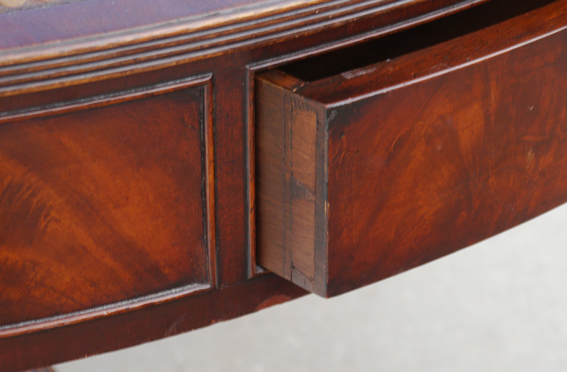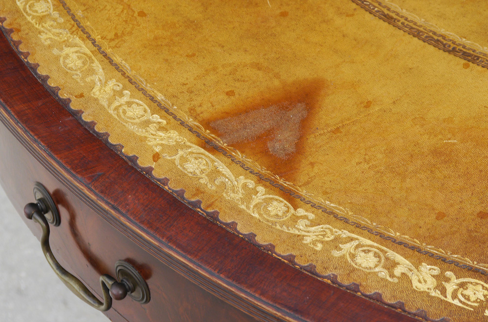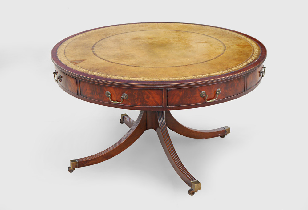 REGENCY STYLE MAHOGANY DRUM TABLE: Round top with inset embossed leather, skirt with 4 drawers. Pedestal base with 4 splayed legs ending in brass caps with castors. 28'' h. x 49 1/2'' dia.