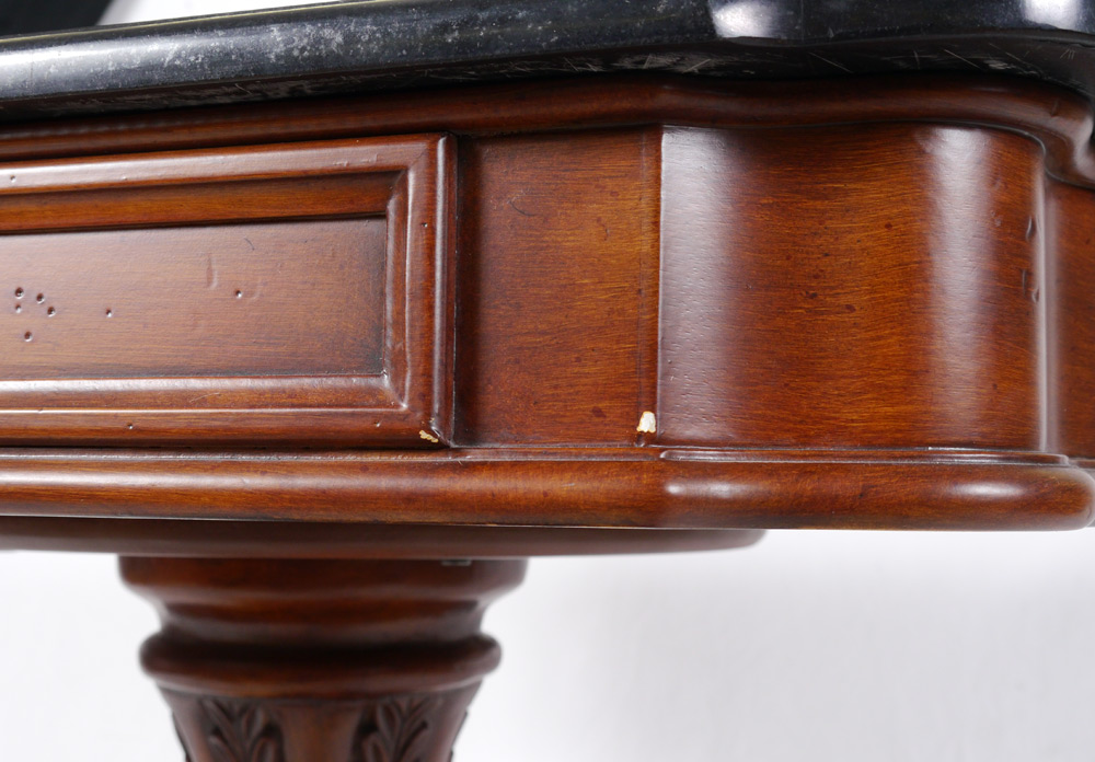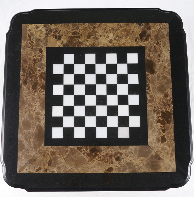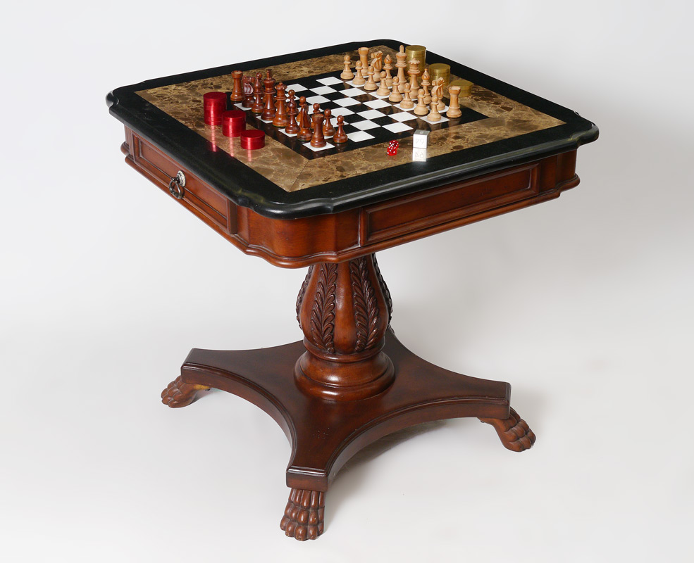 INLAID MARBLE CHESS TABLE: Late 20th century production, shaped inlaid marble top, drawer on either side holds chess and checker pieces. Base with carved acanthus leaf decoration on 4 carved paw feet. Overall measures 30'' h. x 30 1/2''.