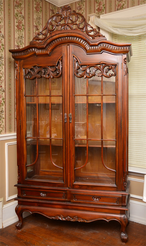 FRENCH STYLE DISPLAY CABINET: Carved openwork pediment over carved and shaped top. 2 glass doors with fretwork, 2 interior shelves. Base with 2 drawers over shaped skirt, paw feet. Overall 83'' h. x 45'' x 16 1/2''.