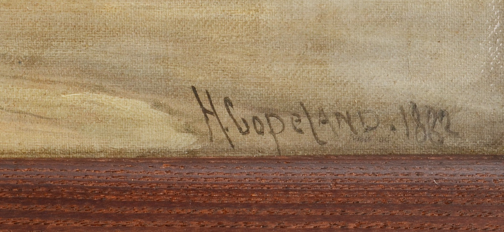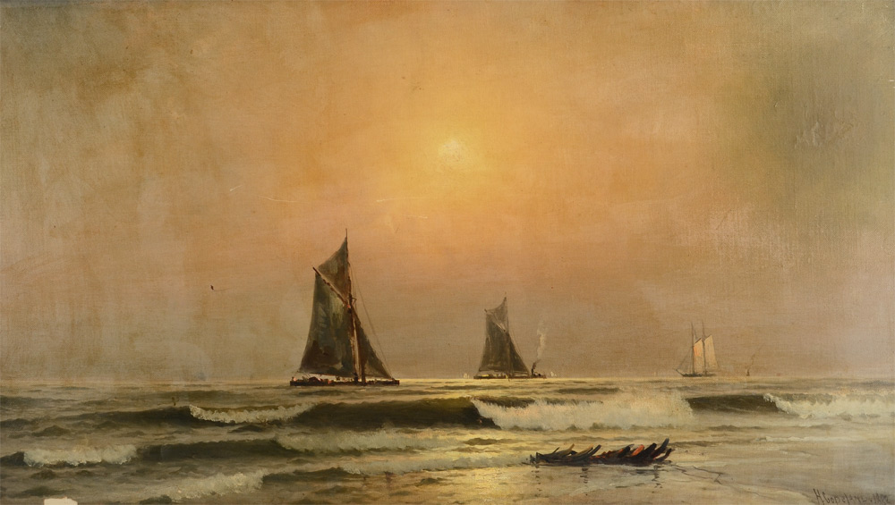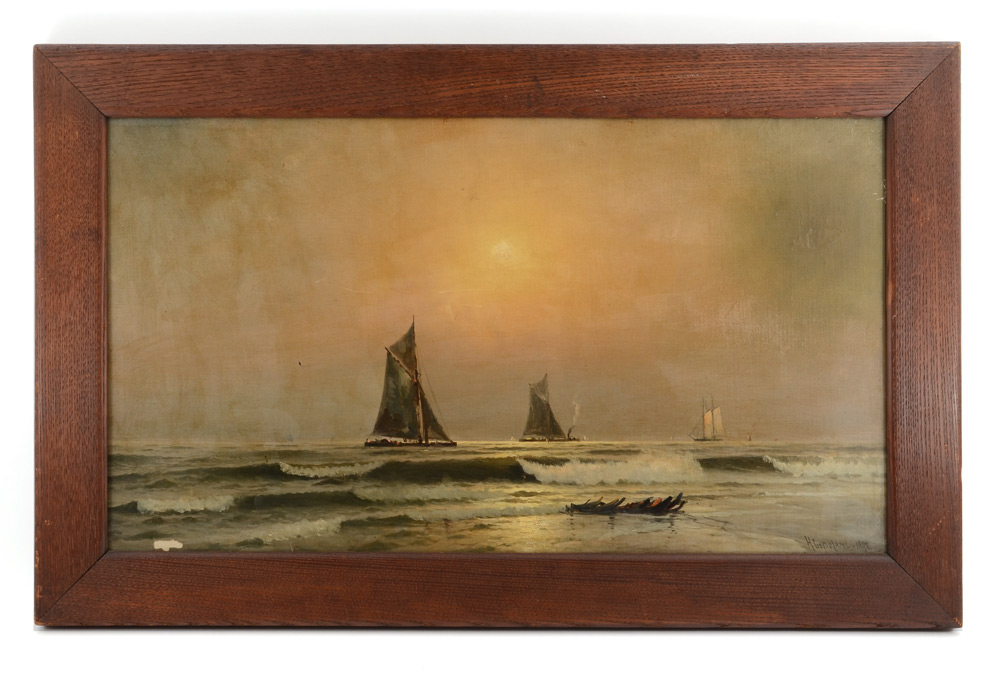 IMPRESSIVE H. COPELAND MARITIME PAINTING DATED 1882: Oil/Canvas, 18'' x 32'', Fishing Boats, Steamships, and Clipper ships, painted from the shore, with the sun setting. Simple wood framing, 23'' x 37''