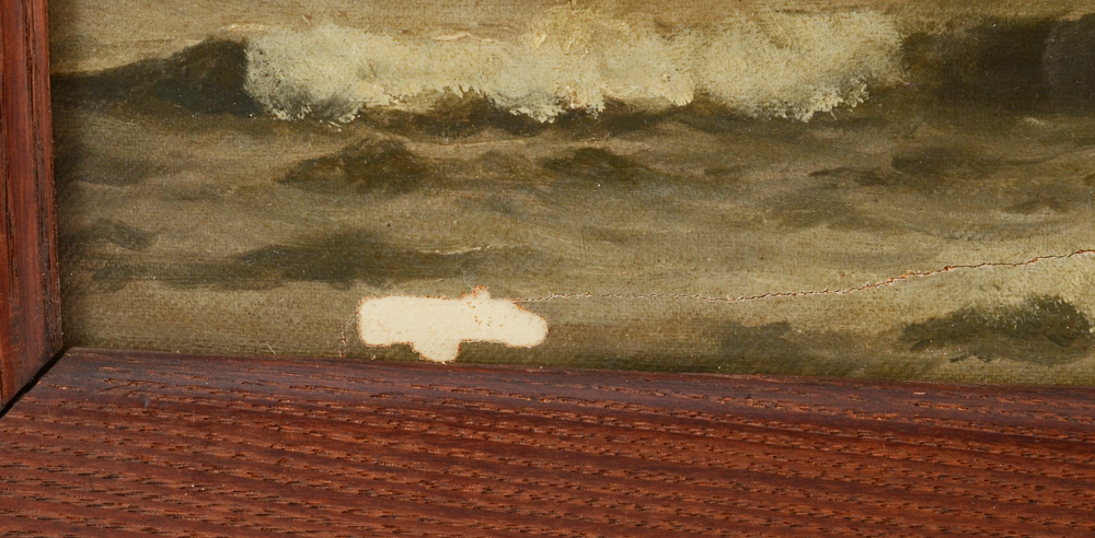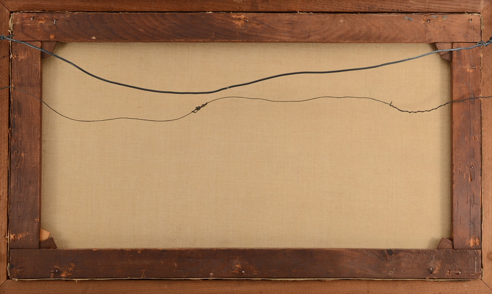 CONDITION: Relined, punctures in left and right corner, needs cleaning, scattered cracklure, some separation from new canvas in upper right corner, loss of canvas in lower left corner, sold as is.