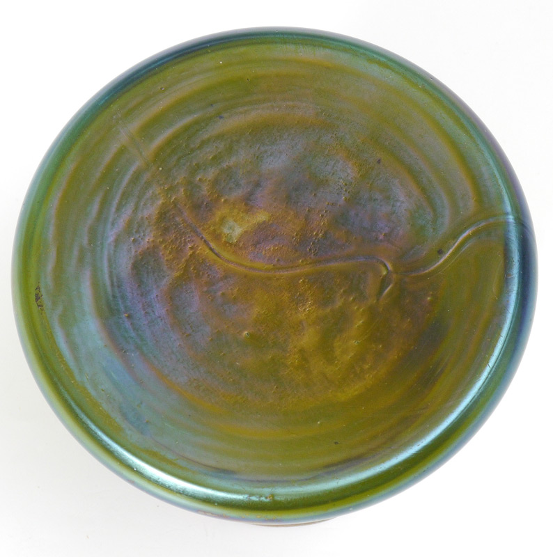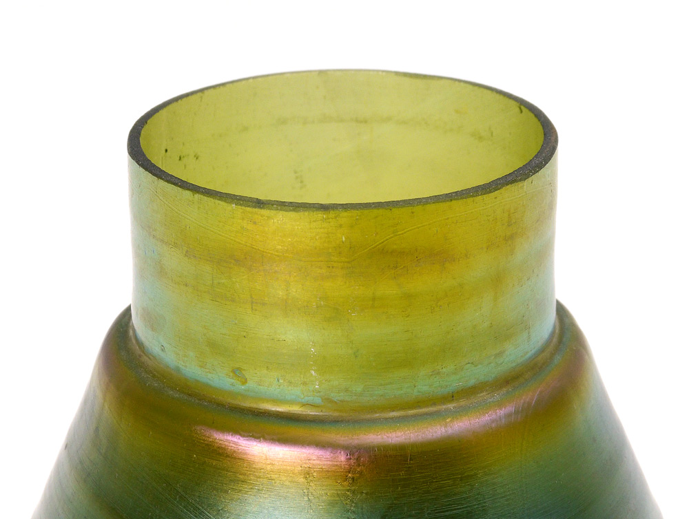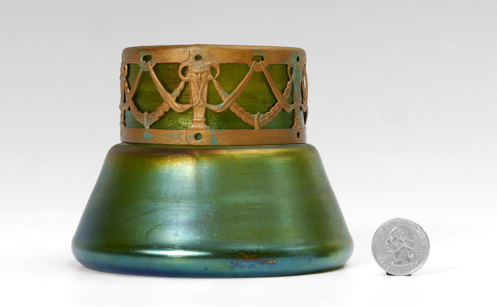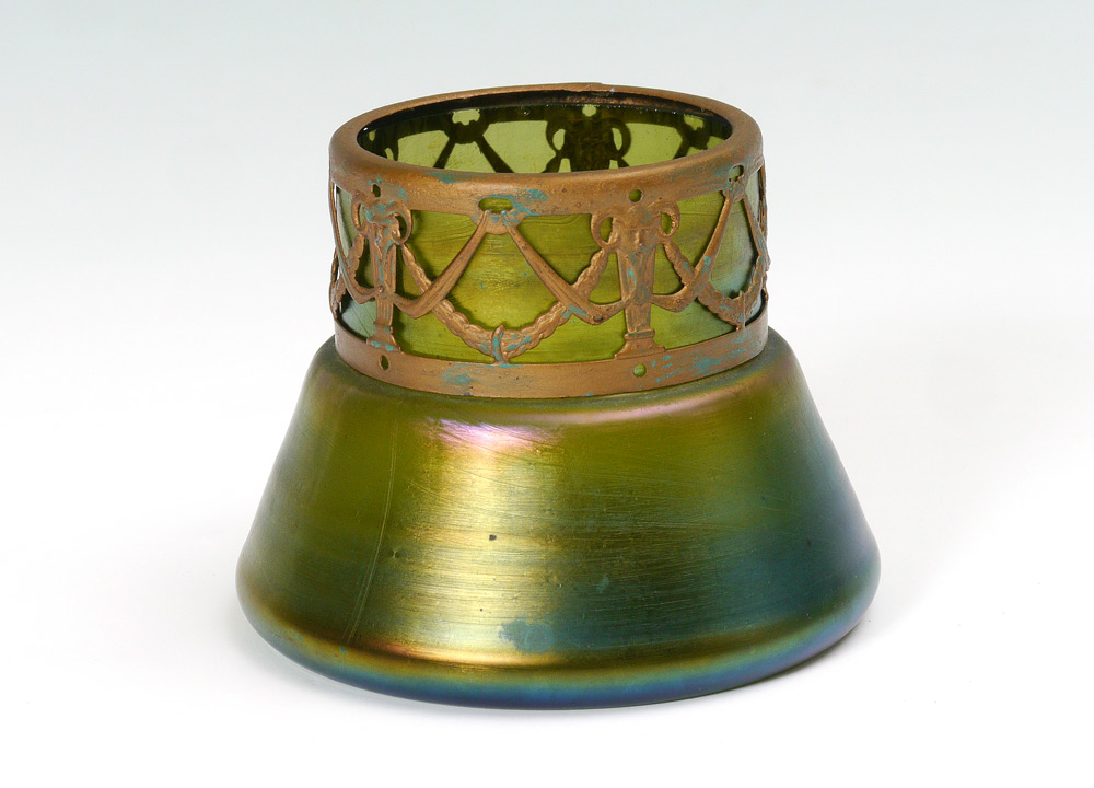 BOHEMIAN GLASS METAL MOUNTED IRIDESCENT VASE: Iridescent green squat vase with patinated metal collar mount with foliate swags and masquerons. Unmarked, 3 7/8'' h. x 5''.