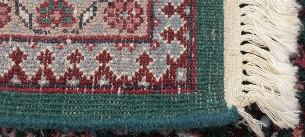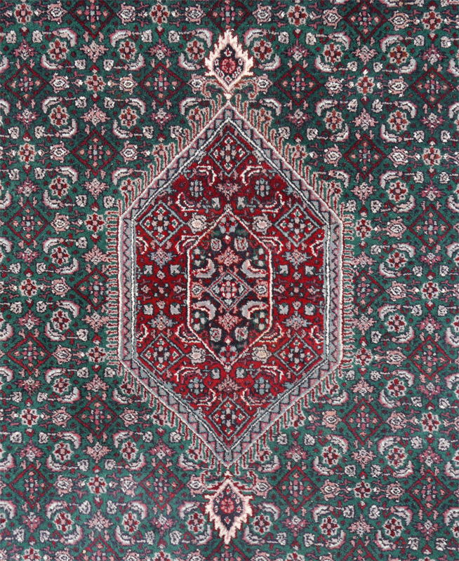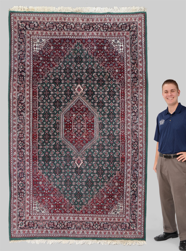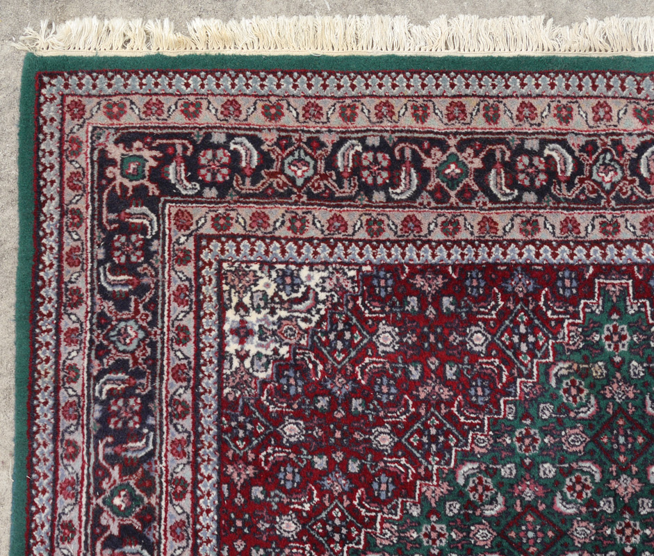 APPROX 20-35 YR OLD INDO-PERSIAN HAND KNOTTED WOOL RUG, 5'11'' x 9'1'': This rug has an overall pattern that is like a modified ''Herati'' design. The red central medallion has small spandrels dangling from each end that go onto the blue/green field. The small motifs that cover the field are done in colors of white, red, blue, and pink. The corners and edge of the field have a red ground that matches the central medallion. Multiple borders complete the design of the rug. This rug would be serviceable and good looking in an office or a den. Condition is good.