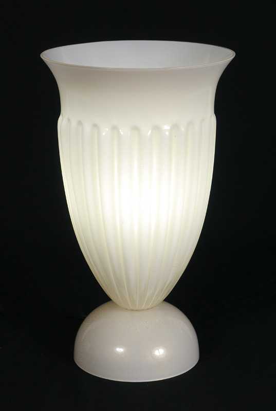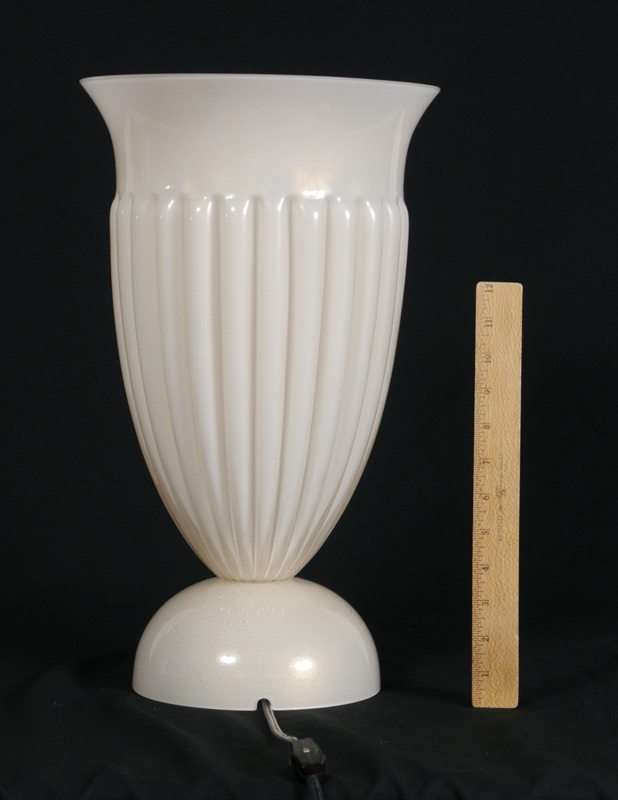 BAROVIER & TOSO TABLE TOP TORCHIERE LAMP: White glass with with metallic flecks. Barovier & Toso label on the underside. Measures 17'' tall, 10'' dia.