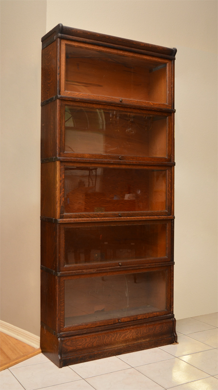 GLOBE WERNICKE OAK LAWYERS BOOKCASE: Five section stacking bookcase, plus the base. Overall measures 79 1/2'' h. x 34'' x 12''.