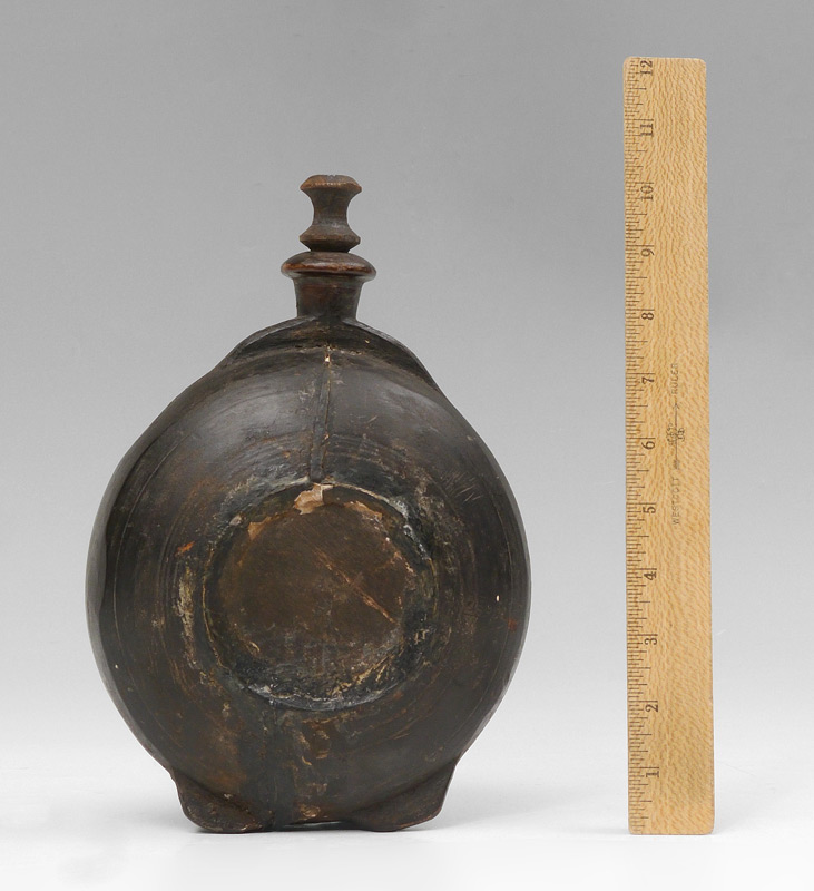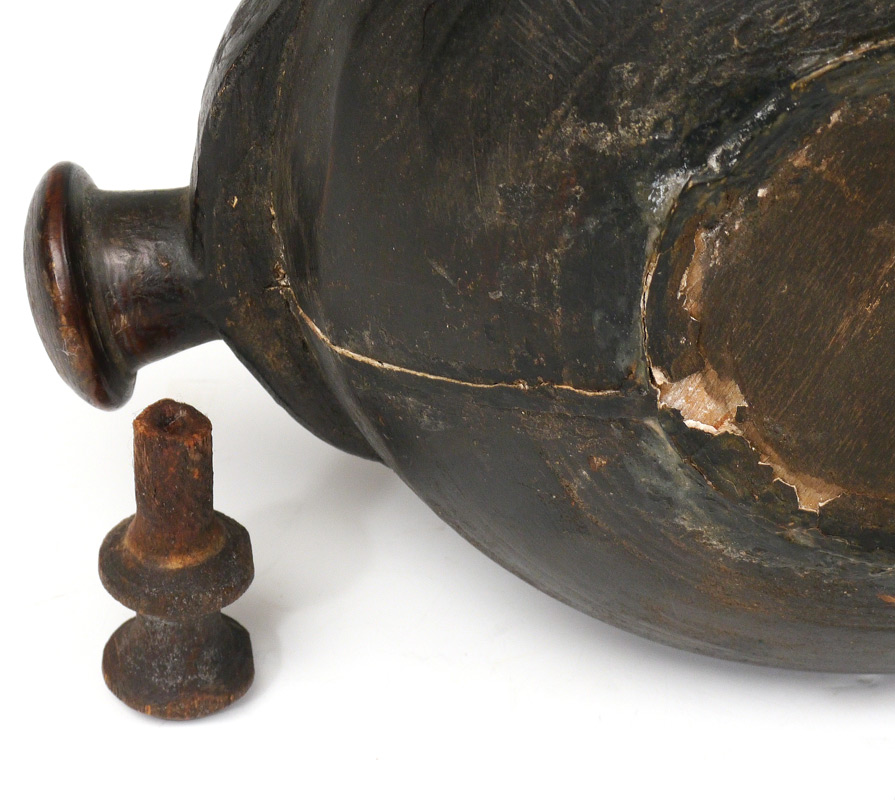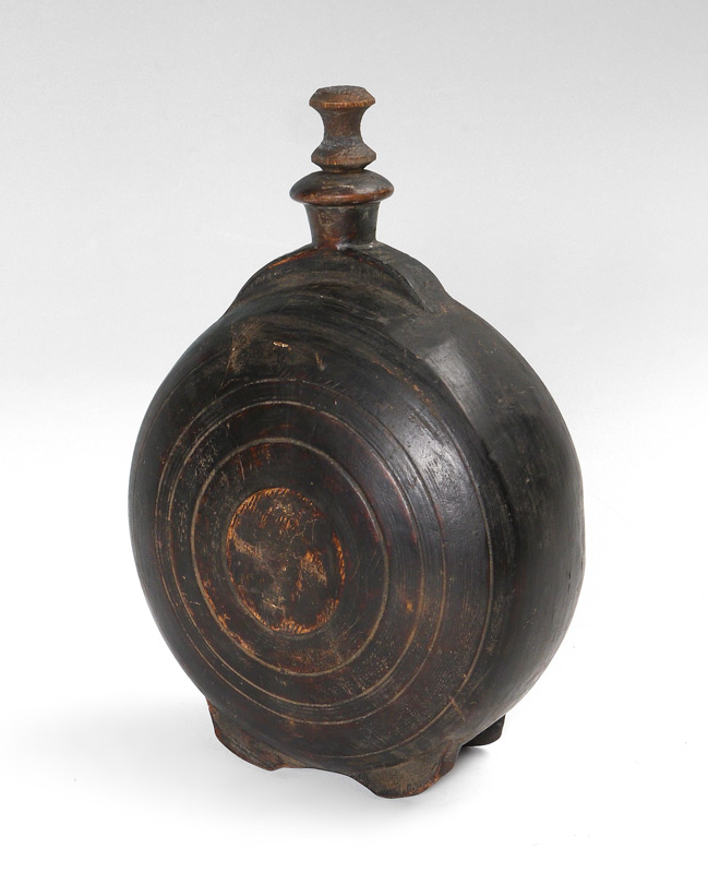 CIVIL WAR ERA CONFEDERATE? WOOD CANTEEN: Carved wood canteen with bullseye design, most likely imported with possible Southern association. Similar known example in the Francis Lord Collection book. Overall measures 10'' h. x 7 1/4'' x 4''.
