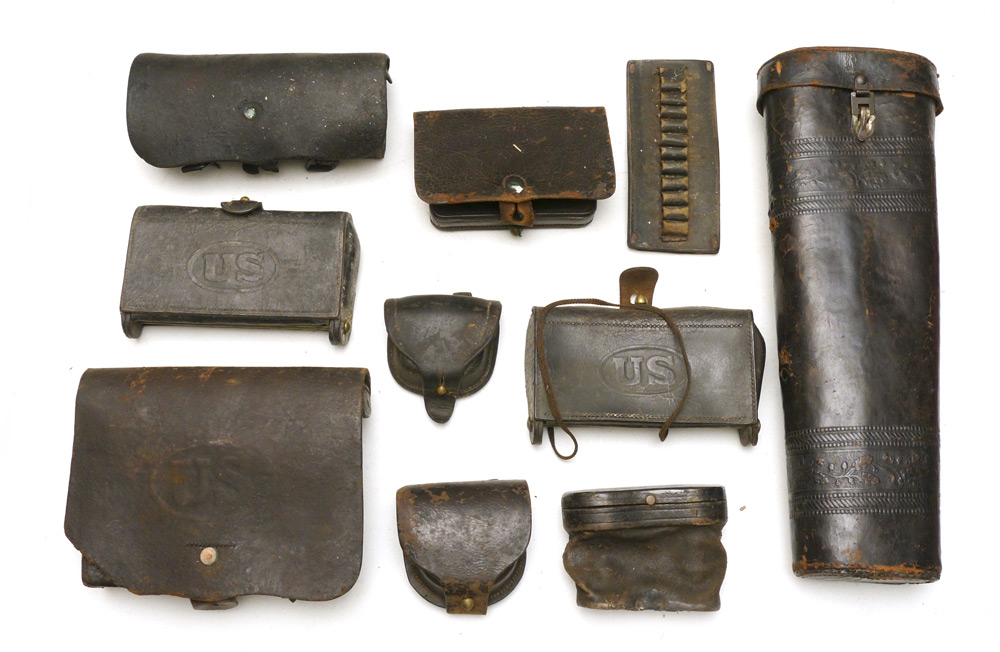 COLLECTION OF 19TH CENTURY CARTRIDGE & CAP BOXES: An assembled collection of leather boxes from the Civil War and later to include 1) Model 1864 cartridge, marked ''US Arsenal, Watertown, 1864'', with original tins. 2) 2 Model 1874 McKeever cartridge, one monogrammed inside E.K.. 3) Civil War era with wood block insert for carbines. 4) Smaller cartridge with no insert. 5) 2 percussion cap boxes, one marked ''E. Metzger, Phila.'' and Hartzell inspector marks. 6) Leather cartridge insert. Sold with leather opera glasses case and another embossed leather case.