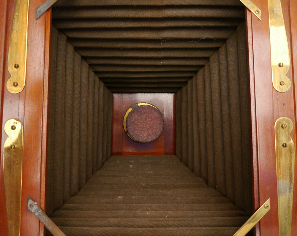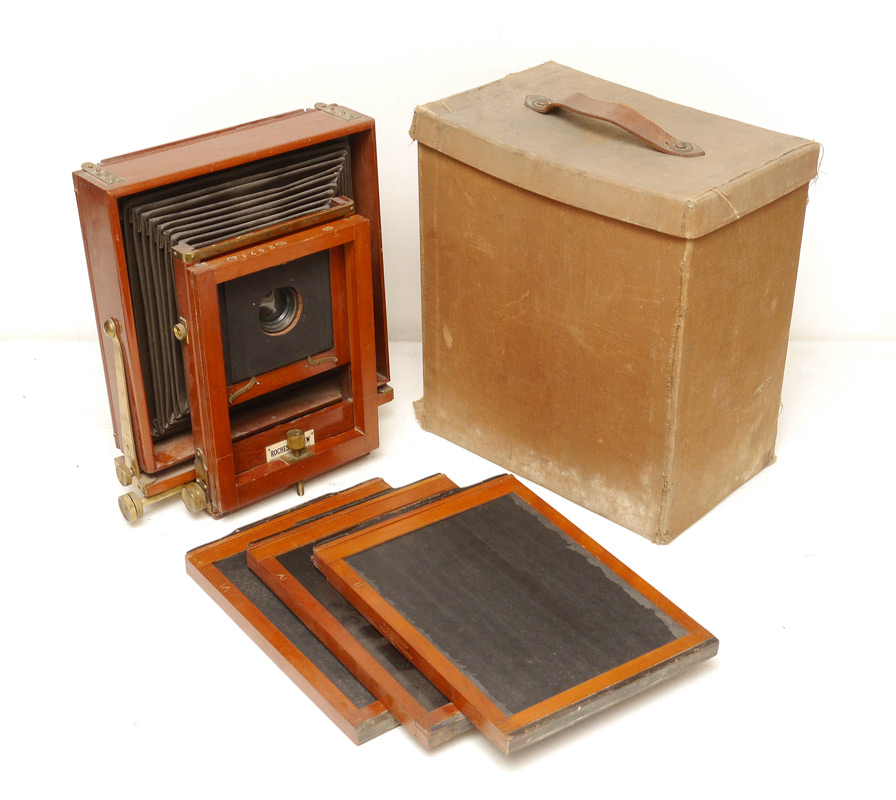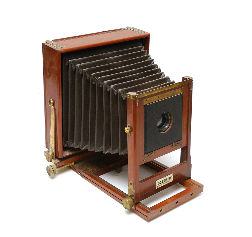 ROCHESTER CAMERA CO. BOX CAMERA: Marked with celluloid plaque ''Rochester View, Rochester Camera Co.'' Closed measures 12'' x 10'' x 5''. Sold with 3 backplates, original canvas case, 13'' x 11 1/2'' x 7 1/2''