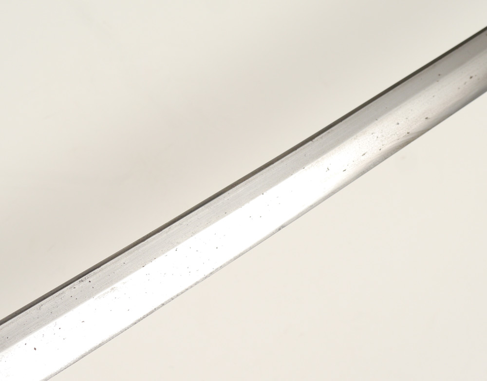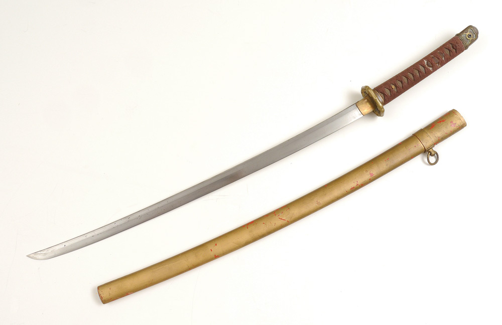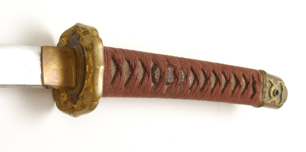 WWII SHIN GUNTO ARSENAL BLADE JAPANESE SWORD: Tang signed Kanetaka or Kaneuji, WWII era blade, Shin Gunto officer mounts. Cloth ito, rayskin same, 2 floral metal menuki. Wood saya has been painted gold at some point. Straight temper 27'' blade to top of habaki, overall 38 3/4'' long in saya. Sold with photocopy of appraisal from Robert Benson.