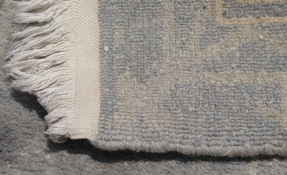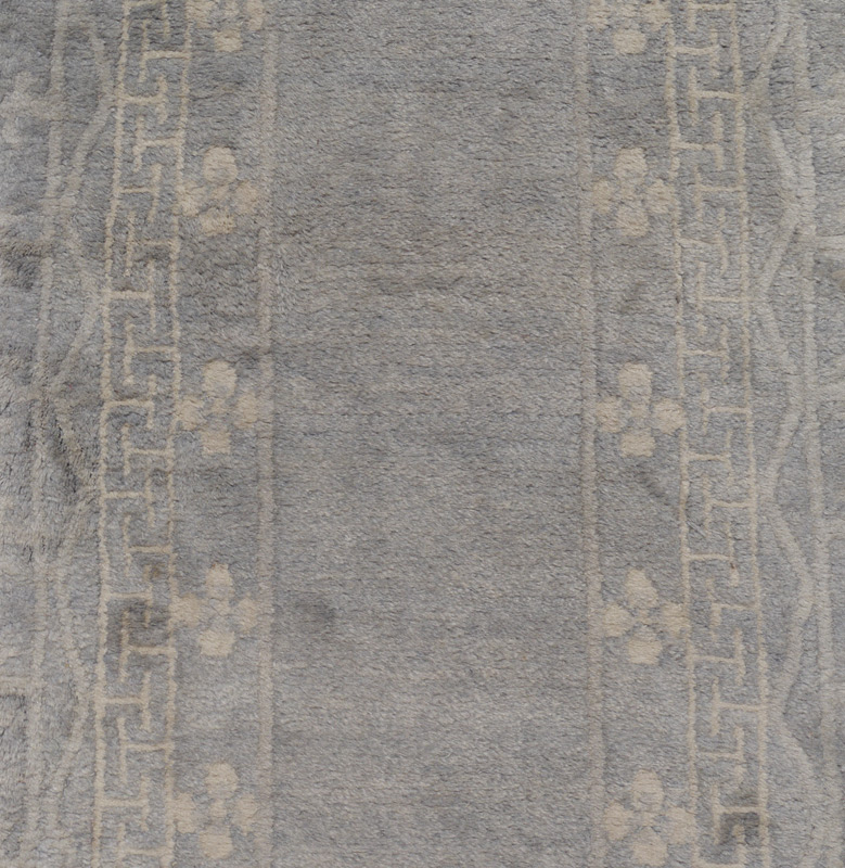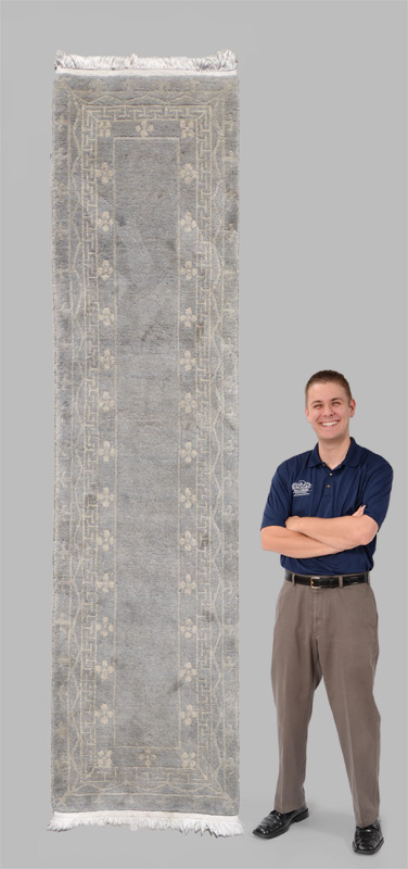 APPROX 20-40 YR OLD TIBETAN HAND KNOTTED WOOL RUG, 2'7'' x 9': This pale blue and gray runner has an open field framed by simple line and circle motifs that form the borders of the rug. This style of rug goes well with modern as we'll as primitive decorating because of its simplicity.