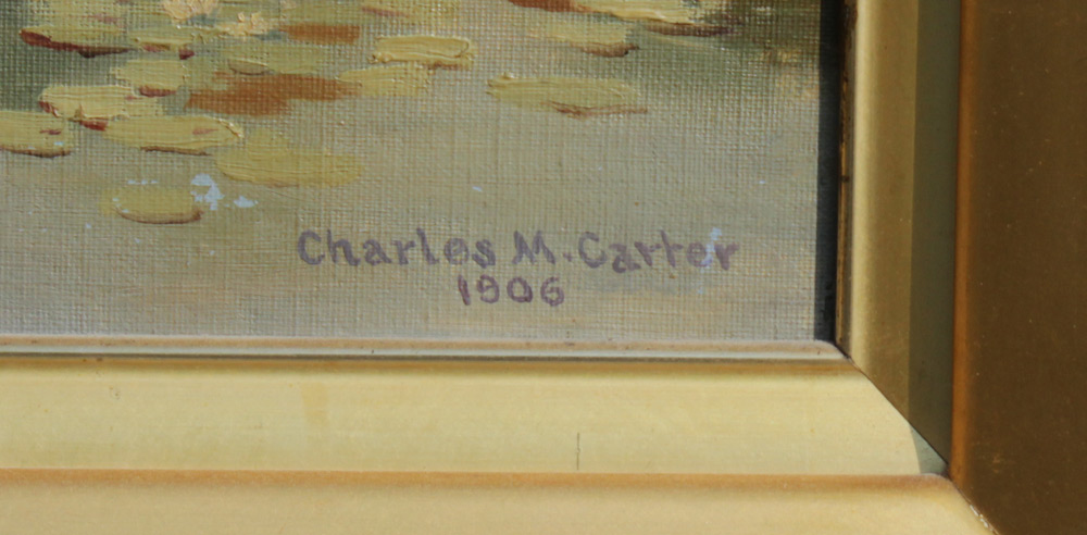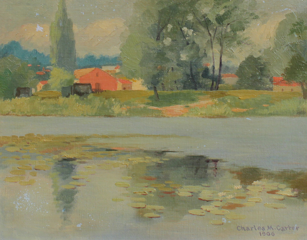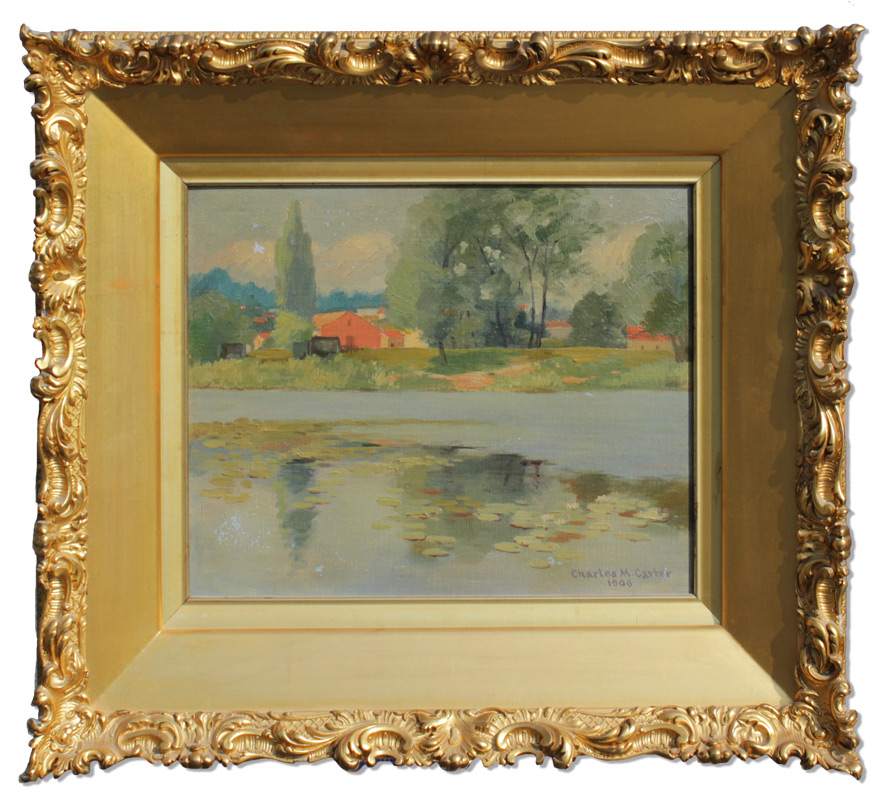 CARTER, Charles Milton, (American, 1853-1929): ''Etang de Brise-Miche'', Village Landscape with Pond, Oil/Canvasboard, 13'' x 16'', signed lower right and dated 1906, affixed label verso from the Artist's Club Annual Exhibition, 1907, artist Denver stencil, encased in elaborate period gilded and carved gesso frame, 22 1/4'' x 25 1/4''.