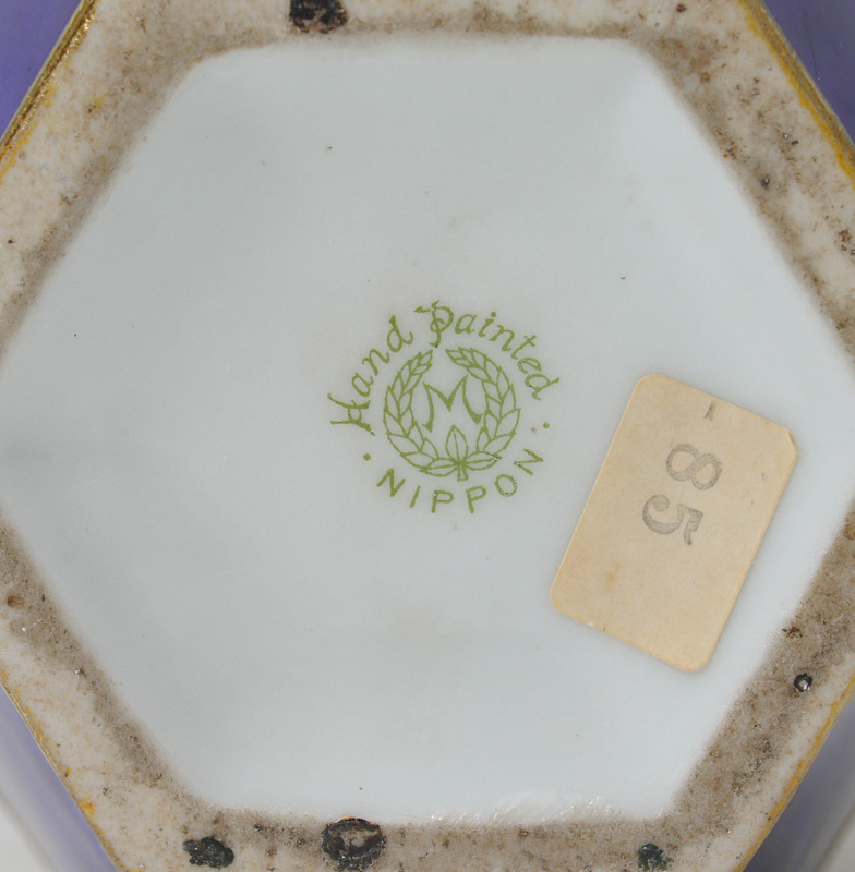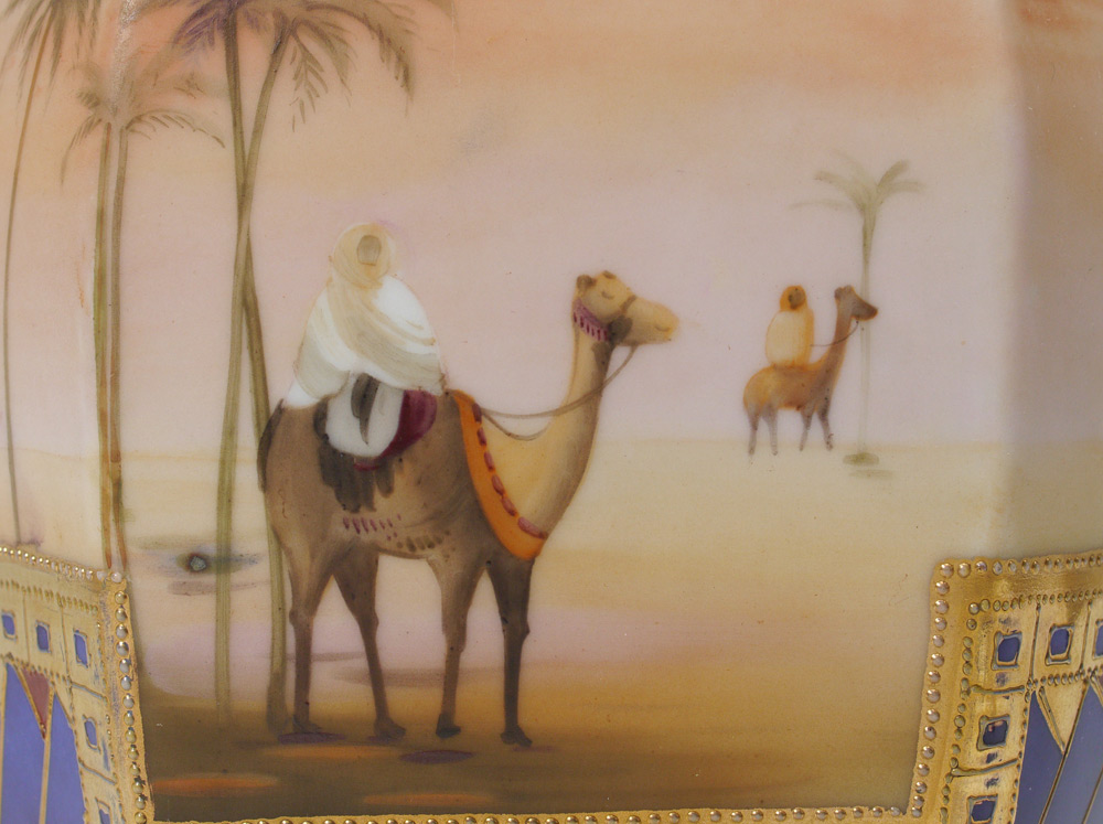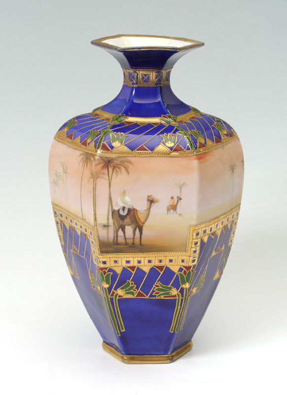 NIPPON HEXAGONAL ORIENTALIST MOTIF VASE: 6 sided vase by Morimura Brother with center hand painted Egyptian desert motif. Flanked above and below with cobalt blue glaze, foliate and geometric decoration. Green 1911-1921 underglaze mark. 10 3/4'' h. x 6 1/2''.