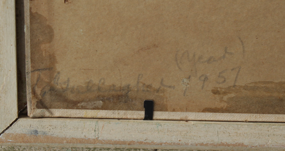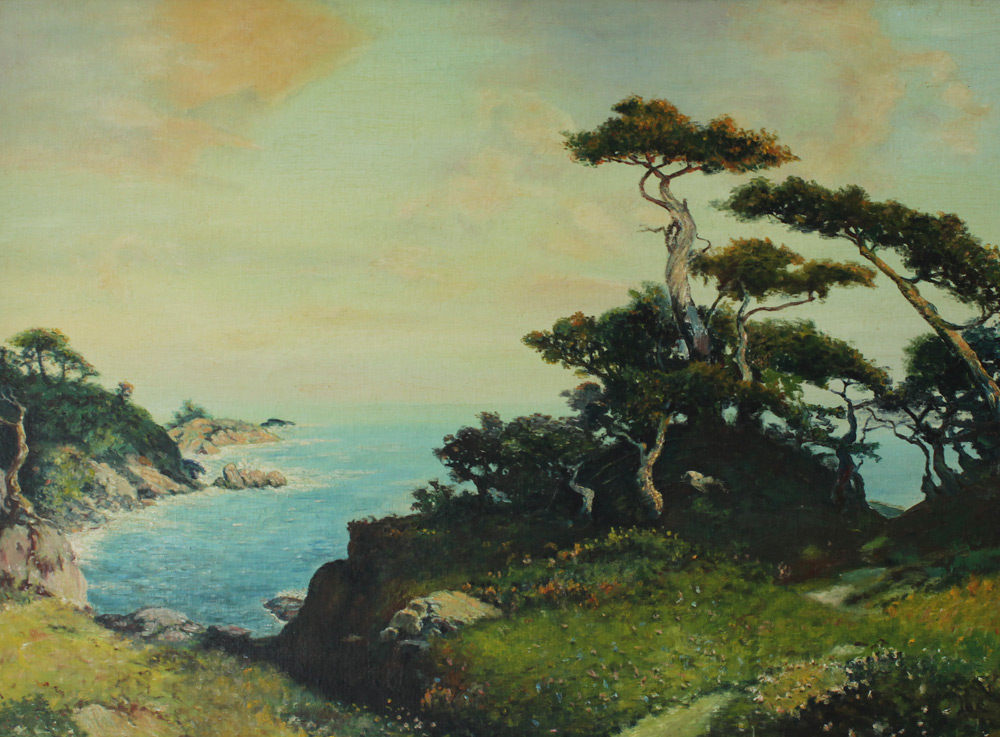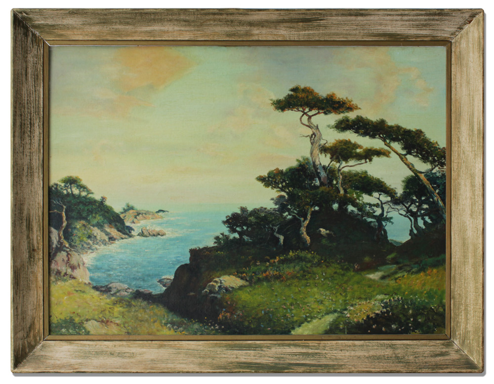 POINT LOBOS PAINTING SIGNED GALLAGHER 1957: Oil/Canvasboard, 21 7/8'' x 29 7/8'', signed verso and dated 1957, painted frame, 27'' x 34 3/4''.