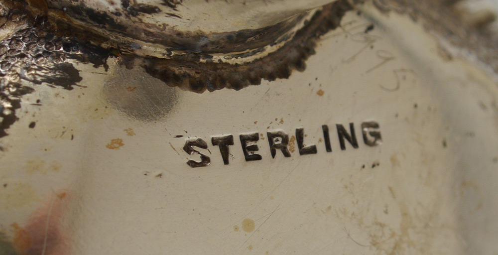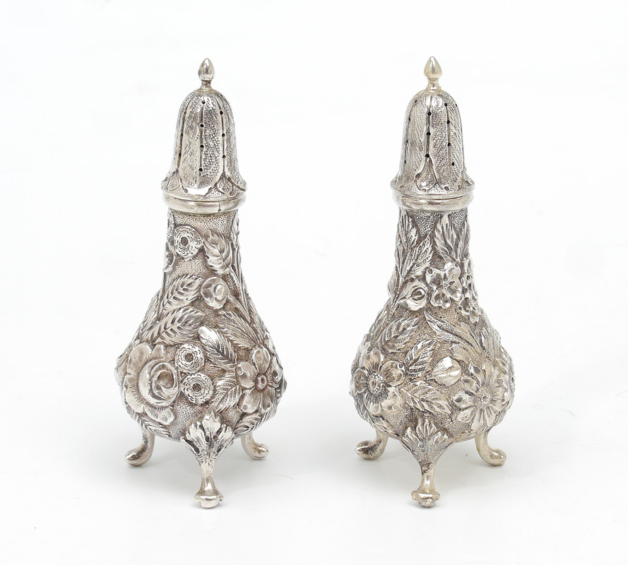 PAIR REPOUSSE STERLING SALT & PEPPER SHAKERS: Simply marked Sterling, most likely Kirk / Stieff with floral repousse designs, on 3 feet. Measure 5 1/4'' h., approx. 9 troy oz.