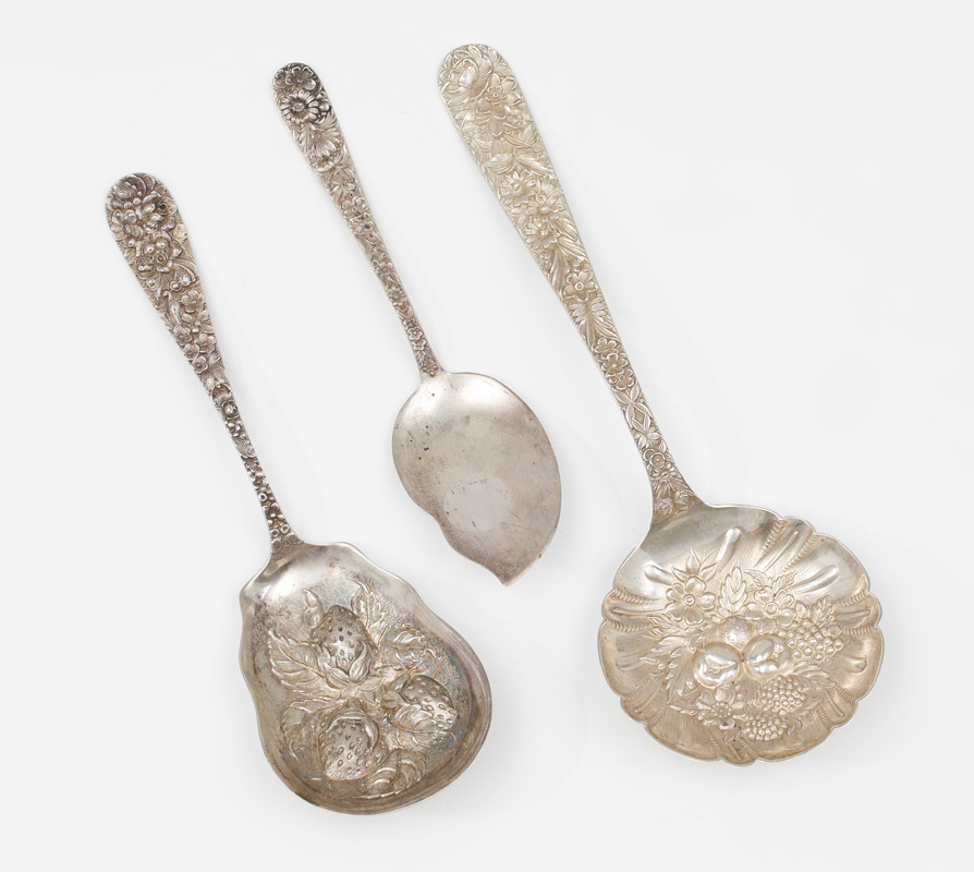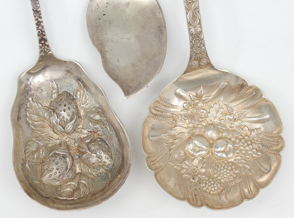 3 PIECE STIEFF / KIRK REPOUSSE SERVING SPOONS: 3 pieces to include 1) Berry serving spoon, 8'' long. 2) Bon Bon spoon, 9 1/8'' 3) Jelly server, 6 3/4''. Approx. 8.3 troy oz.