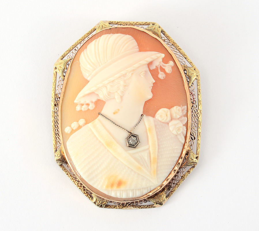 LARGE 14K CAMEO HABILE PENDANT BROOCH: Octagonal filigree 14K yellow gold framed carved shell cameo depicting the portrait of a proper Edwardian lady with diamond pendant. Measures 2 1/4'' x 1 1/4''.