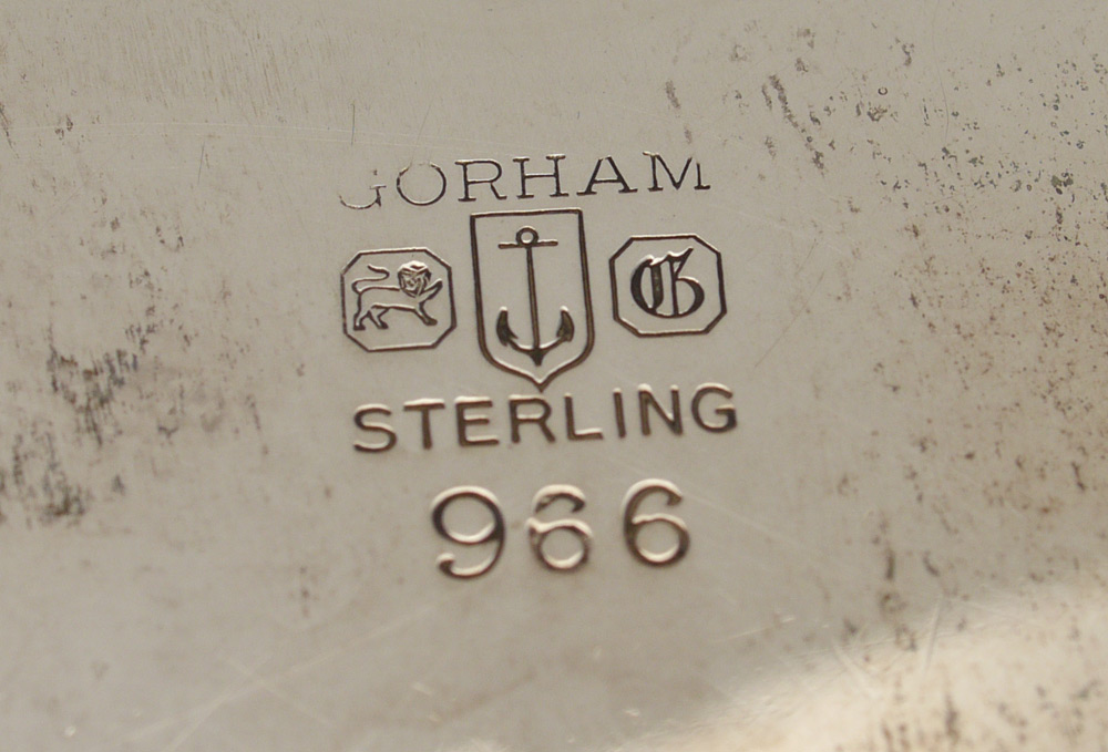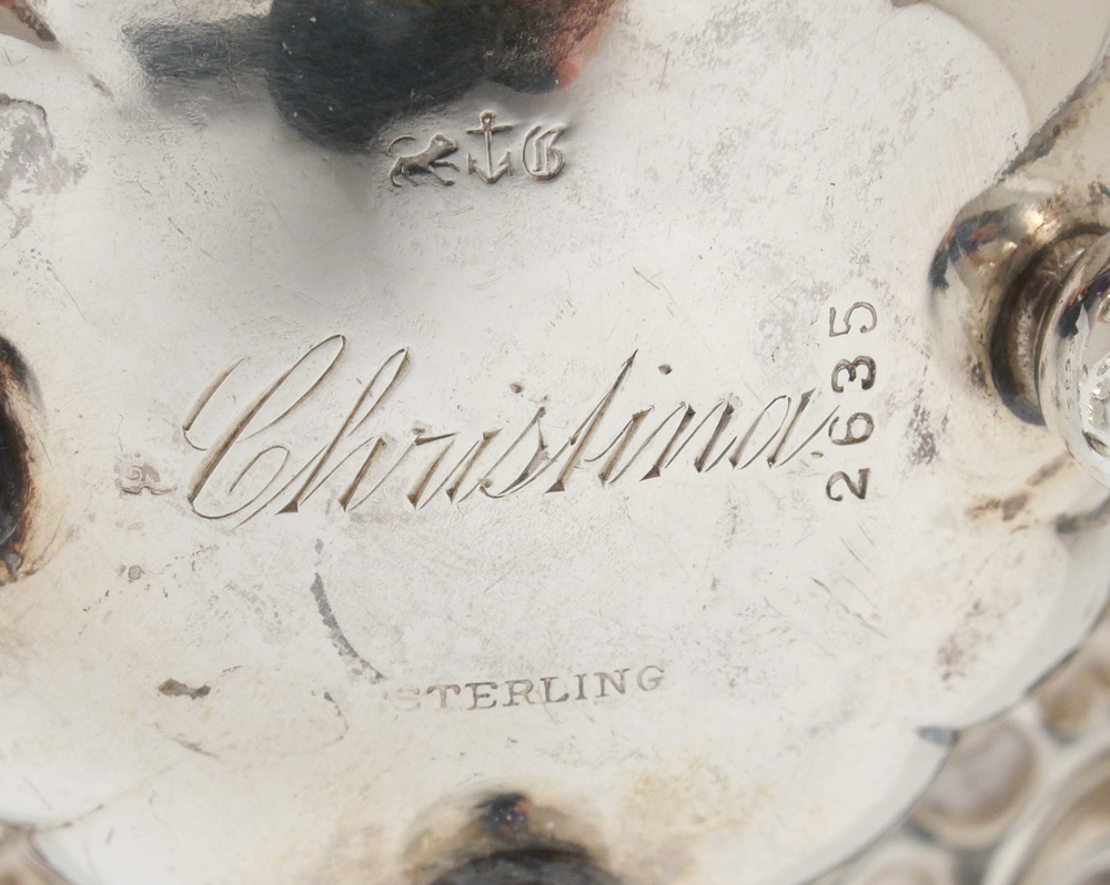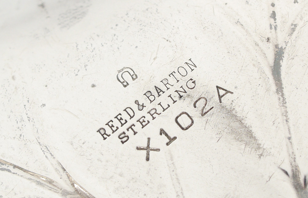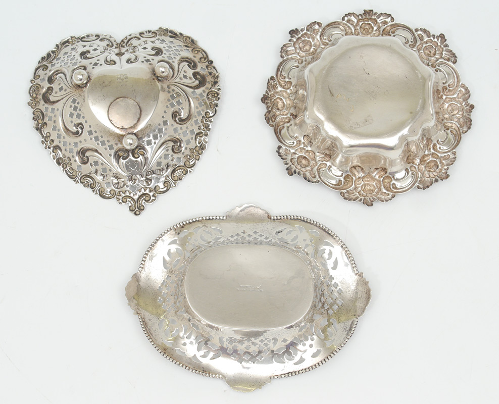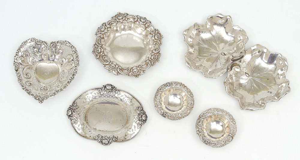 6 PIECE STERLING TRAYS & NUT DISHES: An assembled 6 piece collection to include 1) 1948 Reed & Barton double leaf form handled tray #X102A, 2'' h. x 8 1/2'' x 5 1/4''. 2) Gorham reticulated heart tray #966, monogrammed S, 5'' x 4 3/4''. 3) Whiting foliate repousse rim round dish, 5 1/4'' dia. 4) H. Muhr's & Sons oval dish with reticulated rim, monogrammed B, 5 3/4'' x 4 1/2''. 5-6) Gorham bon bon dishes #2635, monogrammed Christina, 3'' dia. Approx. 14.6 troy oz.