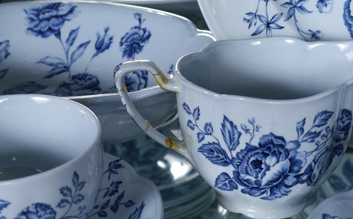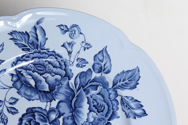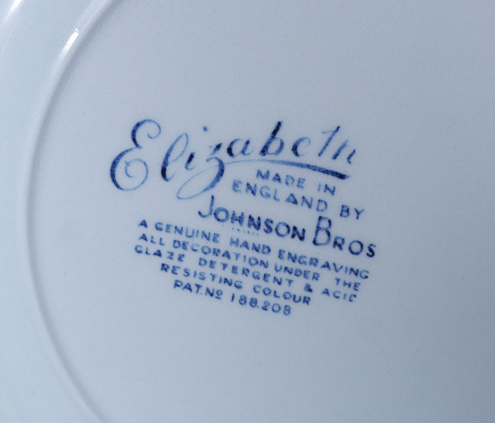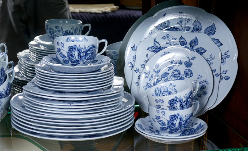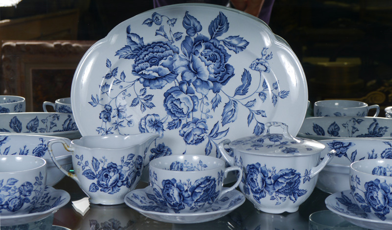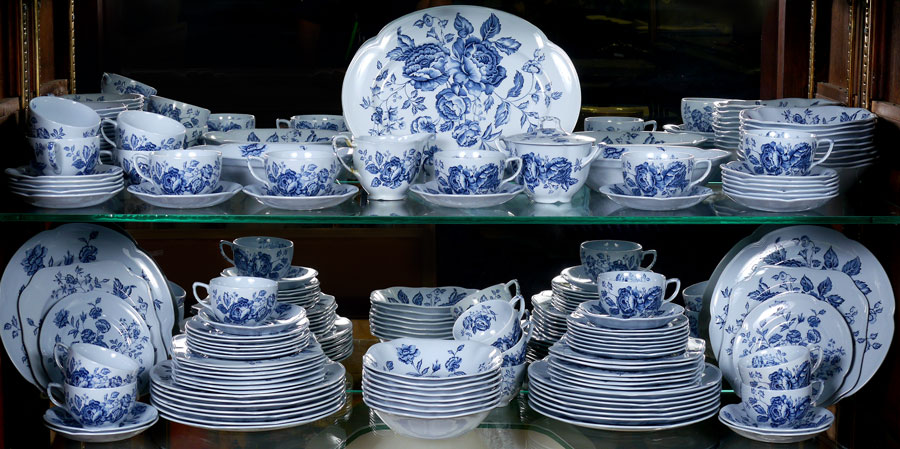 JOHNSON BROTHERS ''ELIZABETH'' CHINA: Blue flowers on blue ground. Approx. 122 pieces to include 16 dinner plates, 16 square salad plates, 13 bread plates, 17 soup bowls, 16 dessert bowls, 17 tea cups, 20 saucers, sugar, creamer (repair to handle), 2 open vegetable bowls, and the 12 1/2'' platter.