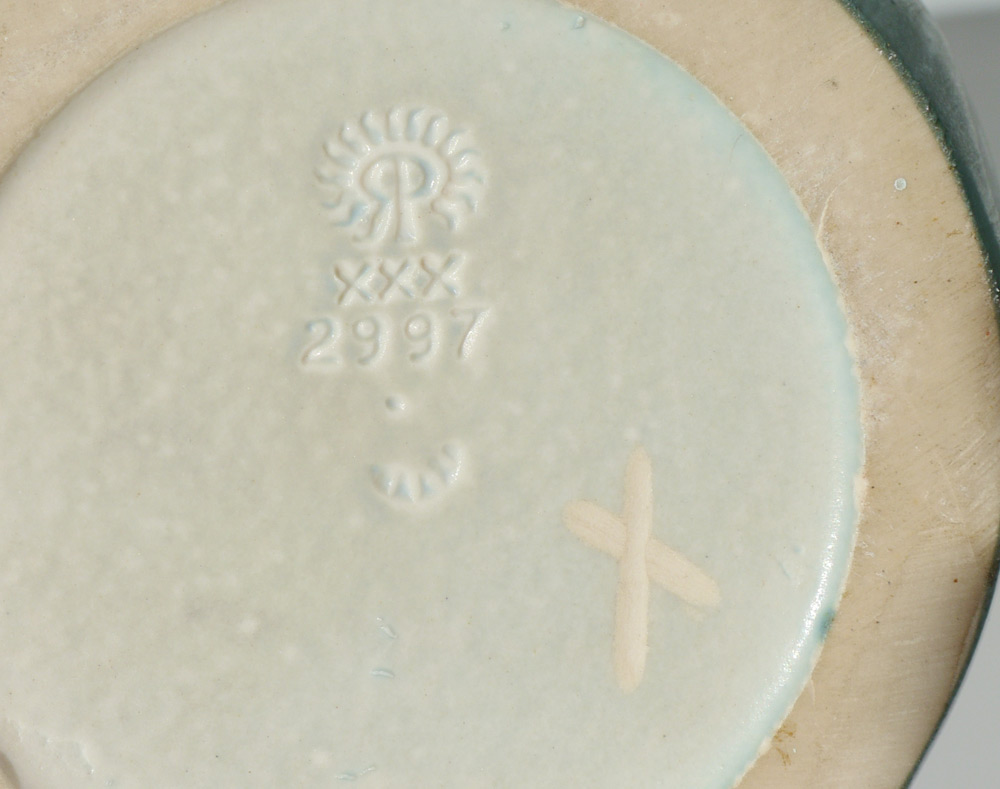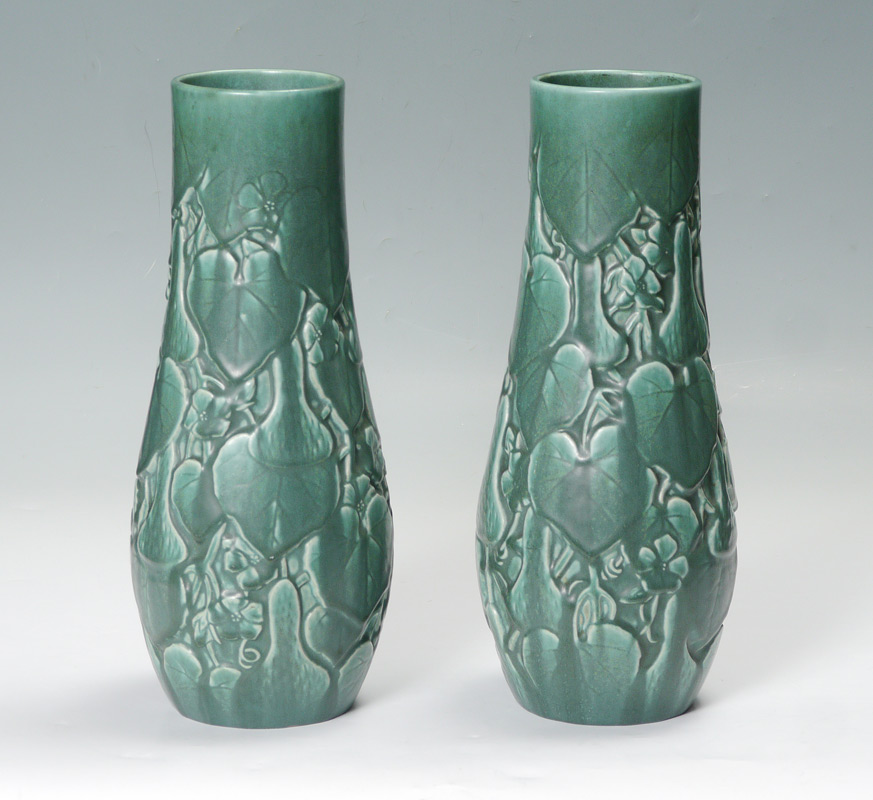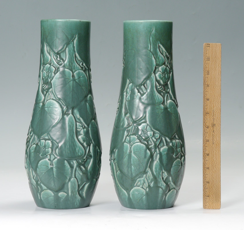 PR ROOKWOOD SHIRAYAMADANI POTTERY VASES: Shape 2997 designed by Kataro Shirayamadani. Deeply embossed vine, gourd and blossom design. Date mark 1930. Each is marked with an X. Measures 13 3/4'' tall.