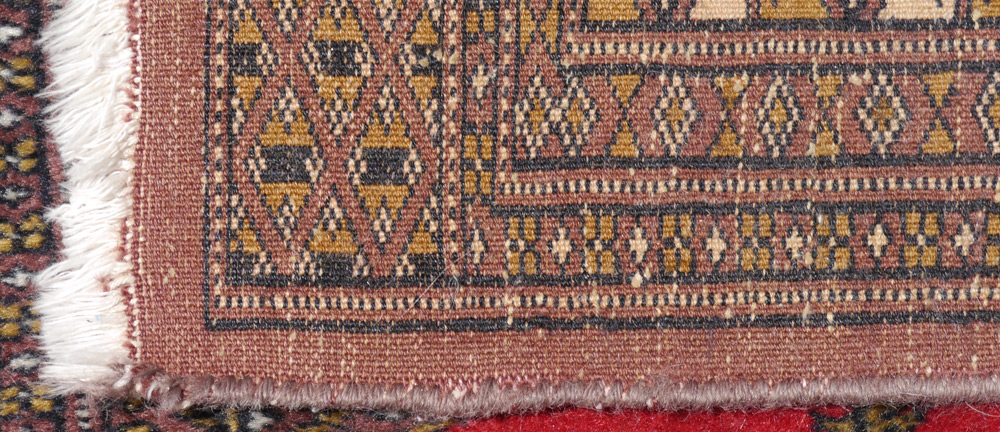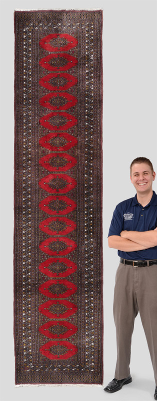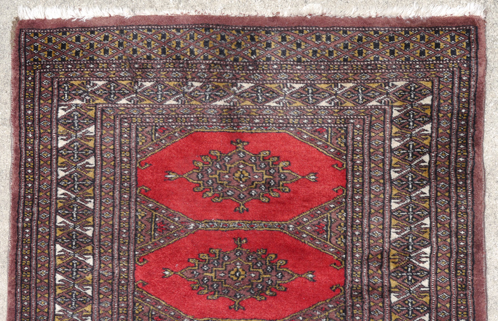 SEMI-ANTIQUE PAKISTANI-BOKHARA HAND KNOTTED WOOL RUNNER, 2'7'' x 10': This Pak-Bokhara has all the traditional design elements and colors found on rugs from this area. The red ground of the field has a rounded shape that frames each individual ''gul'' in the row that spans the length of the rug. The small multiple borders complete the structure of the rug.