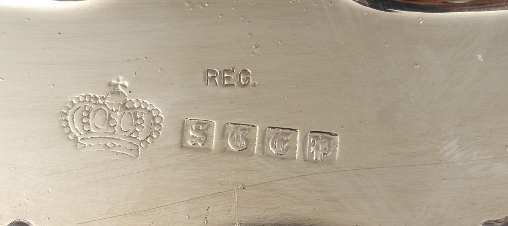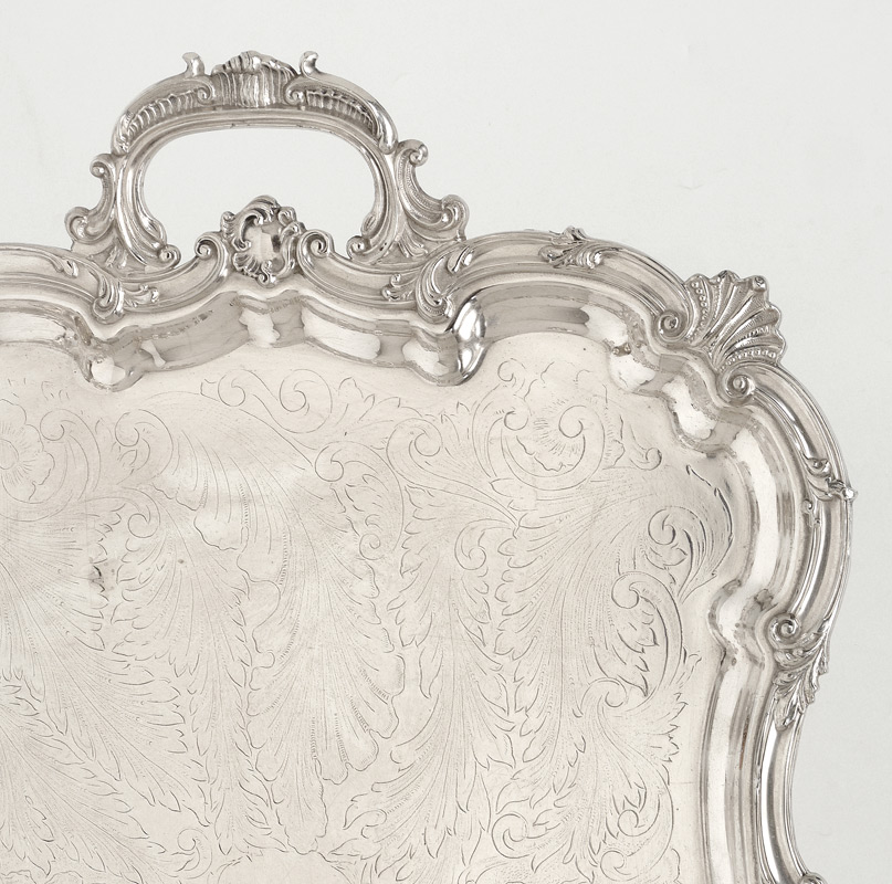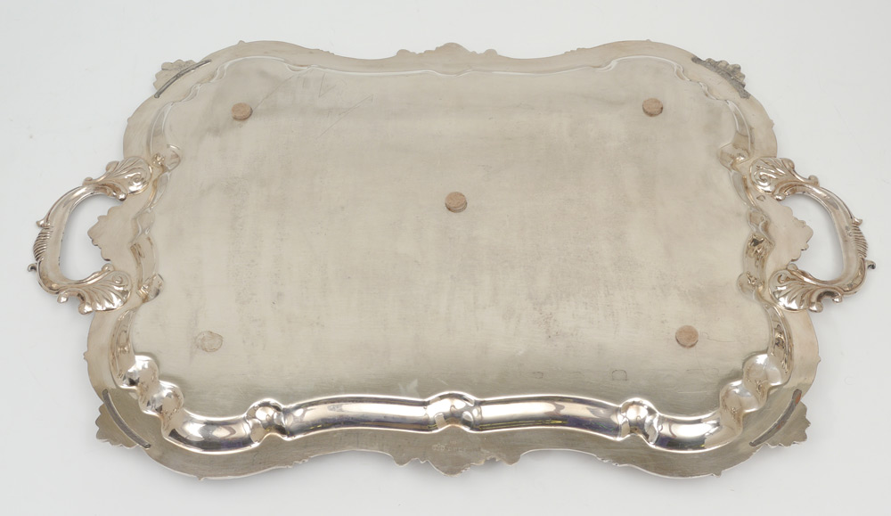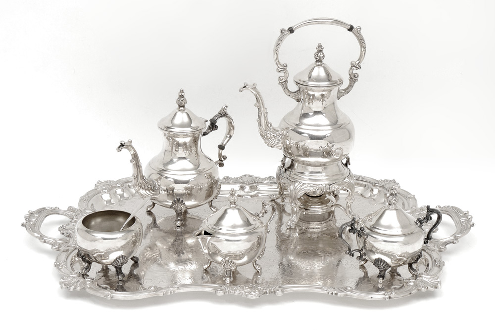5 PIECE ROGERS SILVERPLATE TEA SERVICE: 6 pieces total, 5 pattern number 2377 by F. B. Rogers to include 1) Hot water kettle on stand, 15 1/4'' h. x 9 1/2''. 2) Teapot, 9 3/4'' h. x 11 1/4''. 3) covered creamer, 6'' h. x 7 1/4''. 4) Covered sugar, 6 1/4'' x 8''. 5) Open waste bowl, 3 1/2'' x 4 3/4''. Sold with 6) Goldfeder silverplate tray, 32'' x 20''.